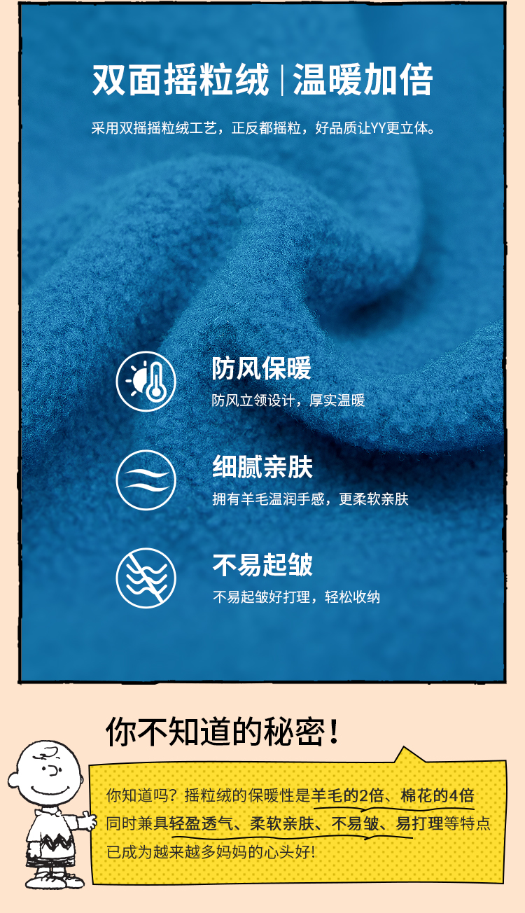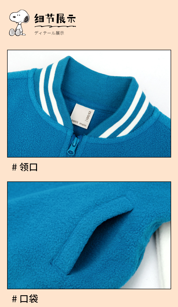 天猫petitmain童装旗舰店129元,可领50元优惠券,实付79元到手,史努比联名系列,柔软摇粒绒,摇粒绒的保暖性是羊毛的2倍、棉花的4倍,同时兼具轻盈透气、柔软亲肤、不易皱、易打理等特点。