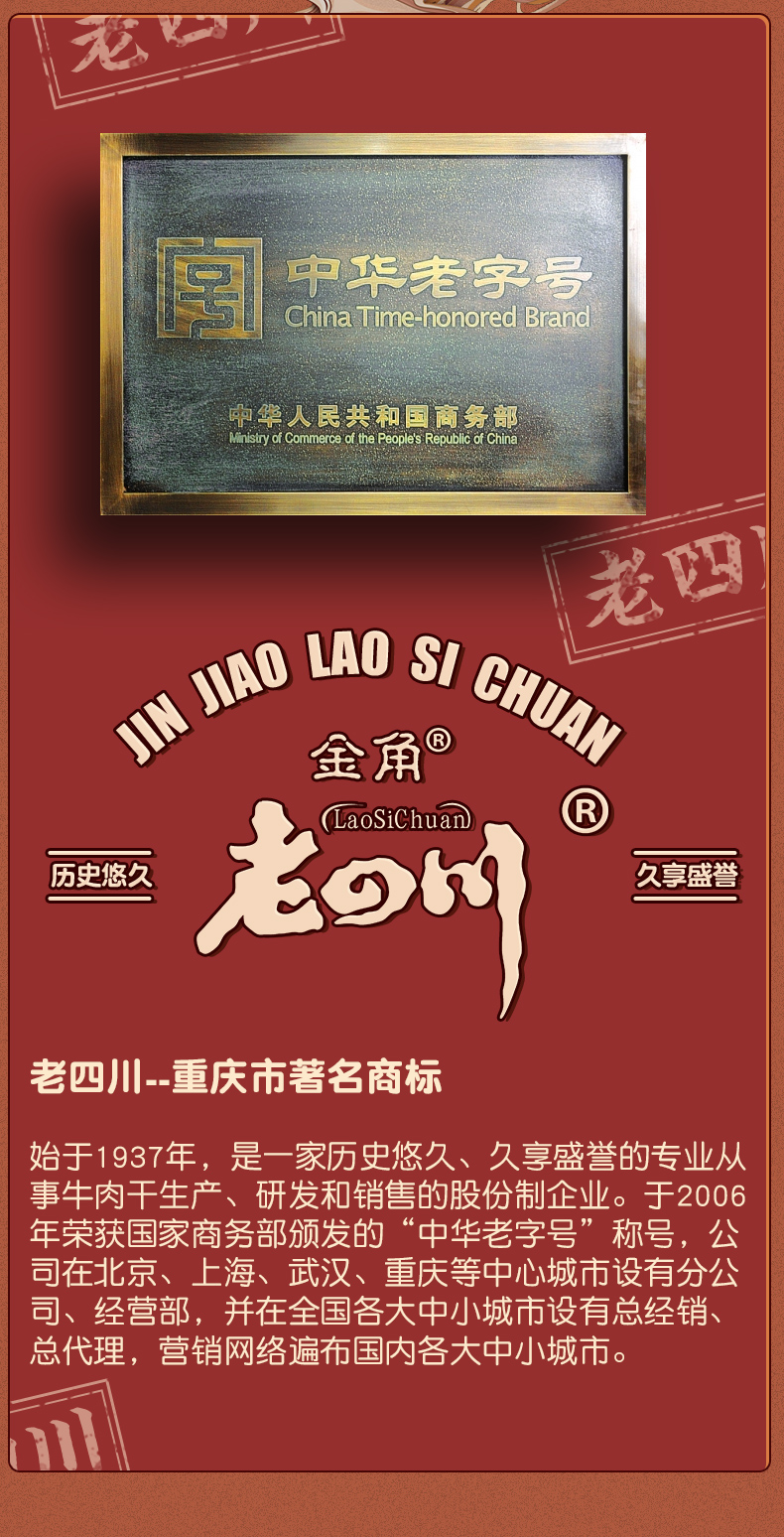 重庆金星股份有限公司生产的“金角”牛肉干始于1937年,为著名重庆特产,曾获“中华老字号”,“四川省工商局著名商标”,“重庆市著名商标”,“重庆知名产品”等荣誉。