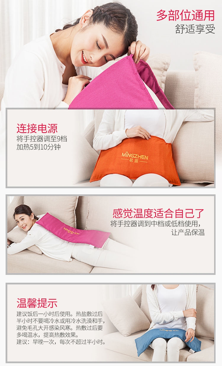 海盐电热敷包采用安全、方便的红外加热的最新技术,以纯天然海盐为主要原料,利用热疗的原理,充分发挥海盐的作用。纯天然海盐品质纯正,富含钠、钾、锶、钙、镁、铁等多种对人体有益的矿物质,加热后可深入人体皮肤内部,带出皮肤下的水分及微细物质,对患病的局部起到舒筋通络、活血止痛和调气血促睡眠、醒神抗疲劳的作用。