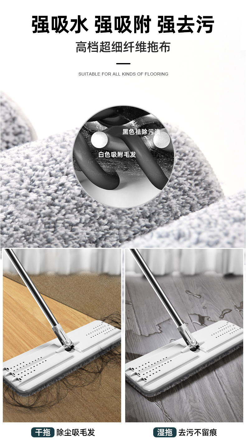 桶盖上有环形挡板,可以防止污水溅出,再也不用小心翼翼地清洗拖把;盖体分离设计,顶盖两侧一键拆卸,方便清洗内壁。高密度纤维拖布,拥有超强吸水能力,无论是油渍、毛发或者灰尘都能轻易吸附,还非常易清洗。