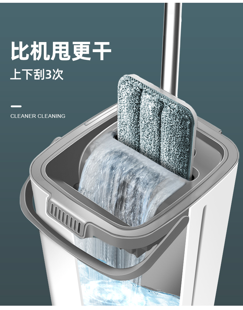 刮桶上附有2个T型孔槽,拖把竖直放入清洁孔槽内,上下滑动两、三次,拖布上的顽垢即可瞬间清除,是一种无比省力的直洗系统;清洗完成后,再放入旁边的脱水卡槽内,重复上下滑动两、三次,即可让拖布清爽干燥。