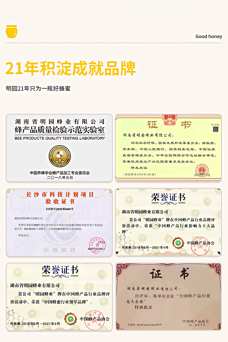 南省明园蜂业有限公司,成立于1998年,注册资金2206.67万,是一家集科研、开发、生产于一体的专业蜂产品公司,拥有1000立方米冷藏冷冻库,标准化检测实验室、和完备的蜂产品开发研制生产设施。通过了HACCP国际食品安全体系认证,被评为“湖南省质量信用AAA企业”。产品远销全国各大中城市和东南亚各国。