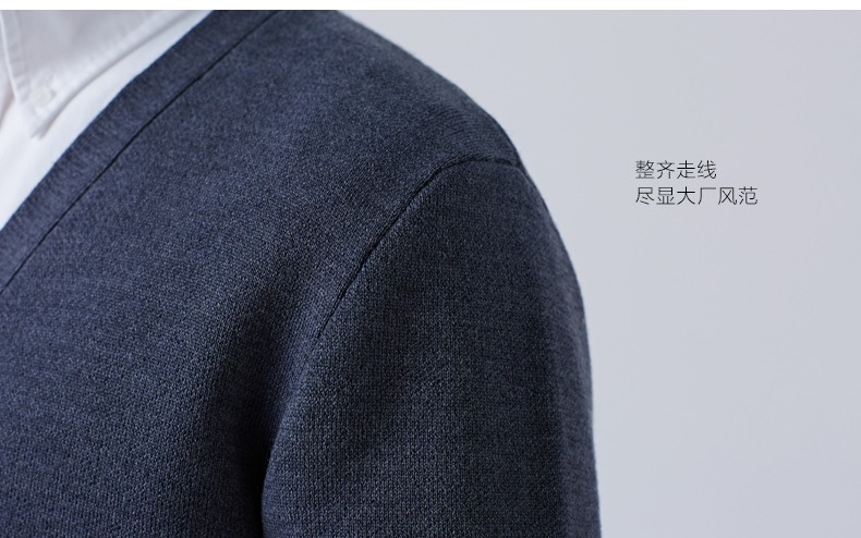 本米加厚V领羊毛开衫,材质为澳大利亚进口美丽奴羊毛,12针织成550克重加厚,比350克重厚57%,虽然为加厚款,但因为织法较为密集,所以面料平滑紧实,穿上并不显臃肿。在细节上,门襟处为防止长期拉扯变形,采用了横螺纹编织,反复拉扯衣服仍然整齐美观。