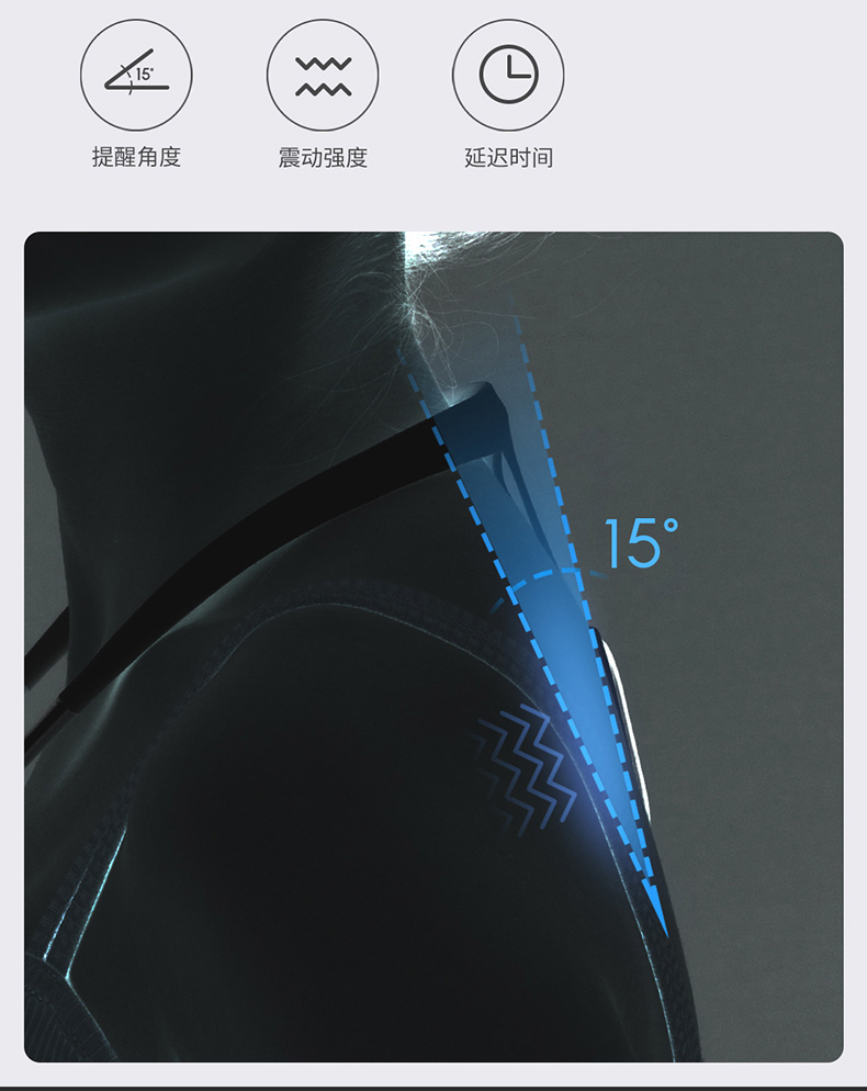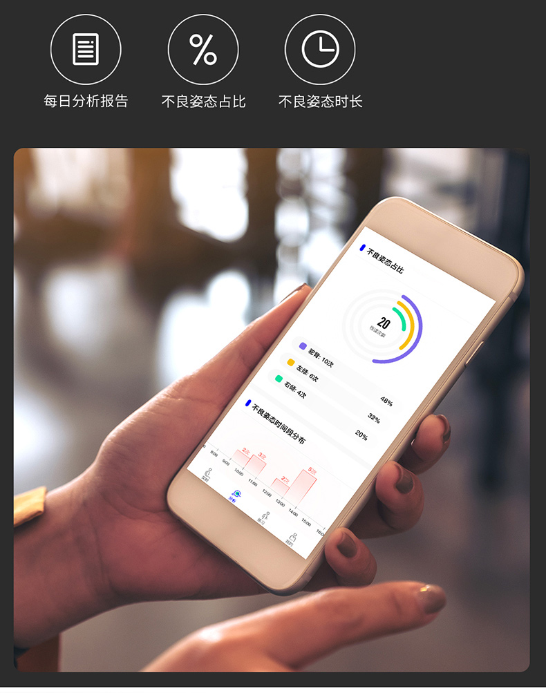 智能感应,实时监测体态,可“私人订制”提醒角度、震动强度、延迟时间,通过每日数据分析,对比不良姿态占比、时长,轻松了解体态变化和进步空间。