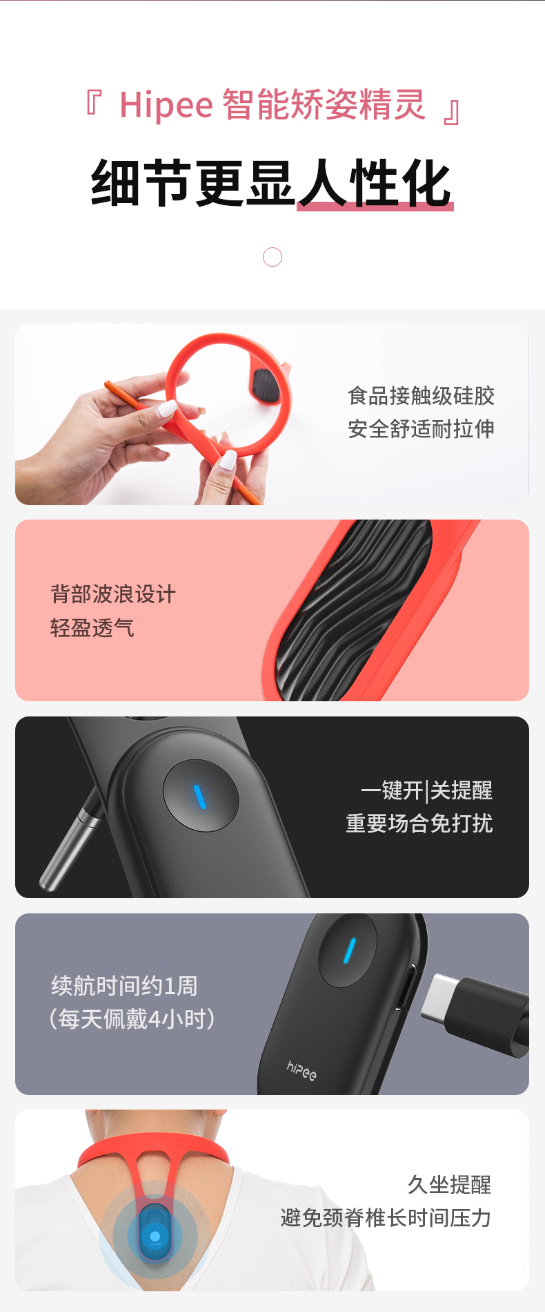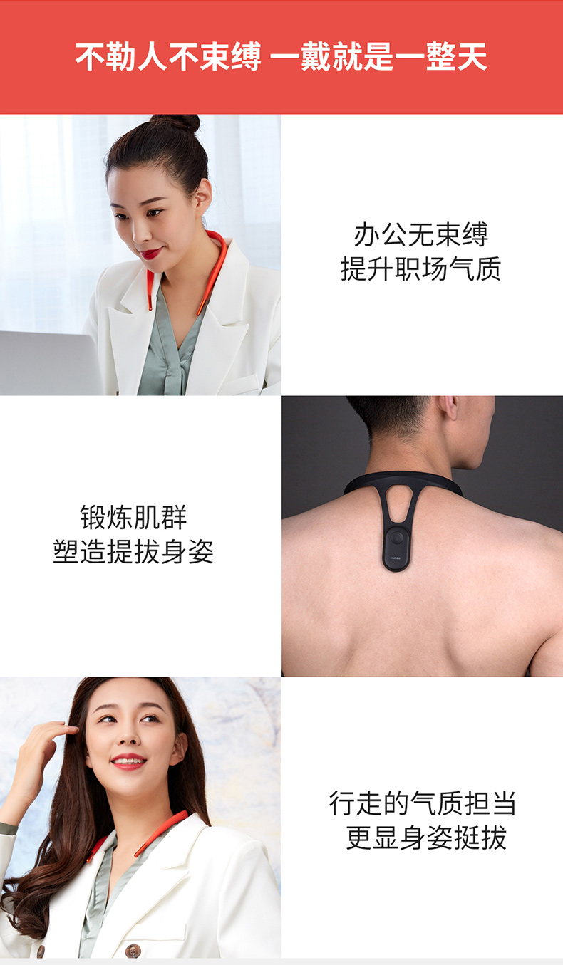 这款hipee智能矫姿精灵,完全区别传统矫姿带,不依托外力,不压迫肌肉,食品级硅胶材质,舒适拉伸穿戴无感,改善含胸驼背的不良习惯,挺拔身姿、提升气质,适合所有人群使用。