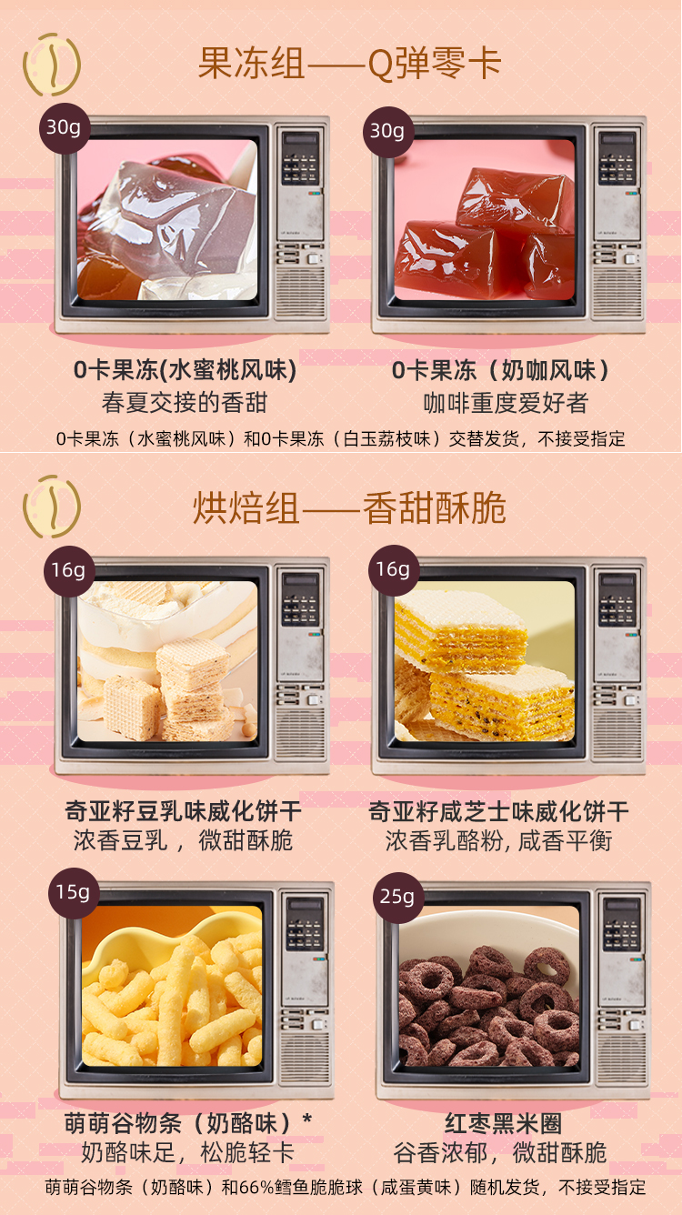 这款薄荷健康 轻卡零食大礼包 18袋,规格: 323g,包含:低脂鸡胸肉肠(原味)25g、低脂鸡胸肉肠(香辣味)25g、低脂夹心牛肉豆脯22g、口袋鸡胸肉(川辣味)15g、口袋鸡胸肉(孜然味)15g、低脂蛋清鸡肉饼20g、高蛋白小酥鱼(海苔)15g、脆香鳕鱼皮(咸蛋黄味)6g、脆香鳕鱼皮(劲爽藤椒味)6g、零卡果冻(水蜜桃味)30g、零卡果冻(奶咖味)30g、奇亚籽豆乳味威化饼干16g、奇亚籽咸芝士味威化饼干16g、萌萌谷物条(奶酪味)15g、红枣黑米圈25g、扯扯素肉(五香味)12g、扯扯素肉(麻辣味)12g、低脂魔芋爽(香辣味)18g。