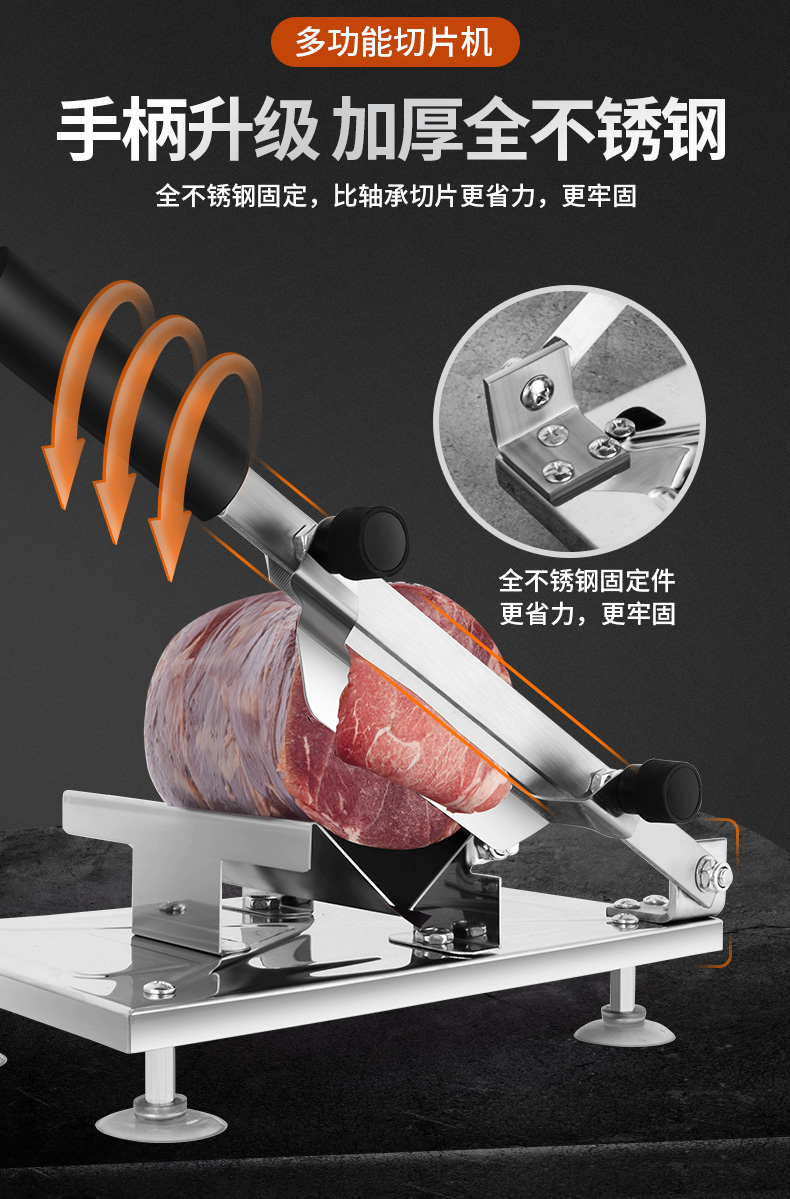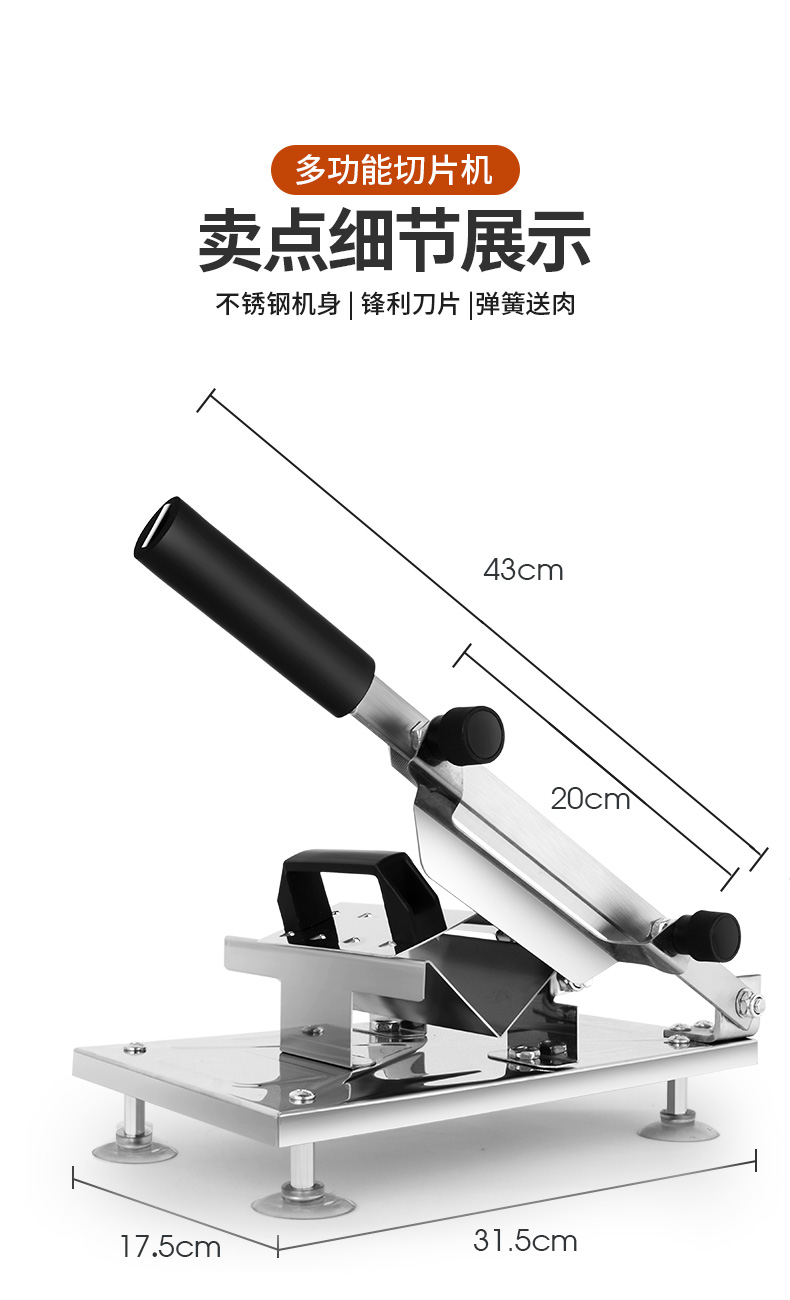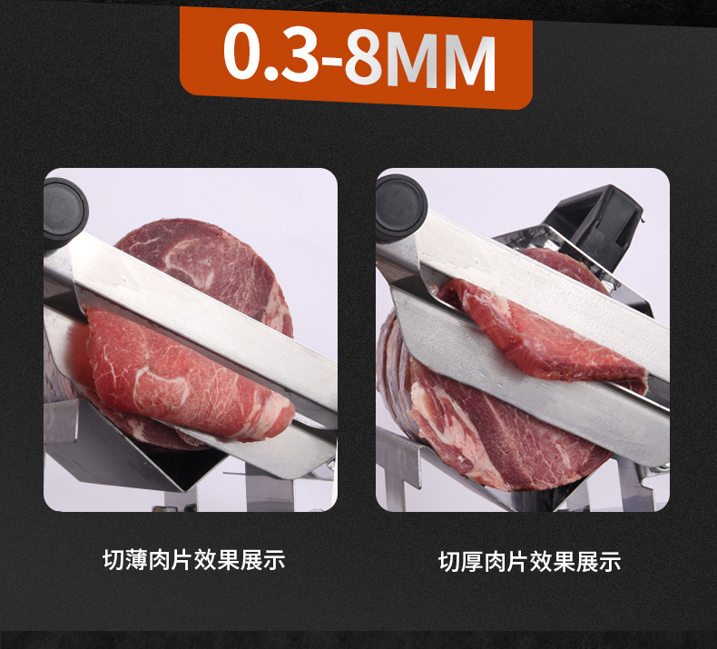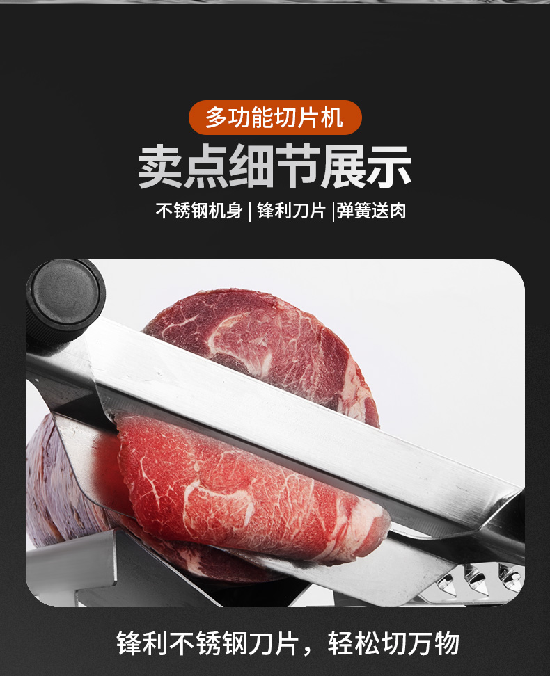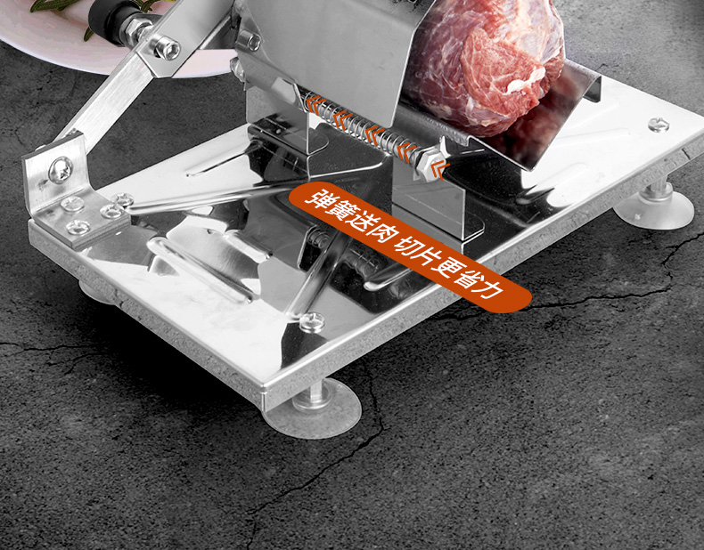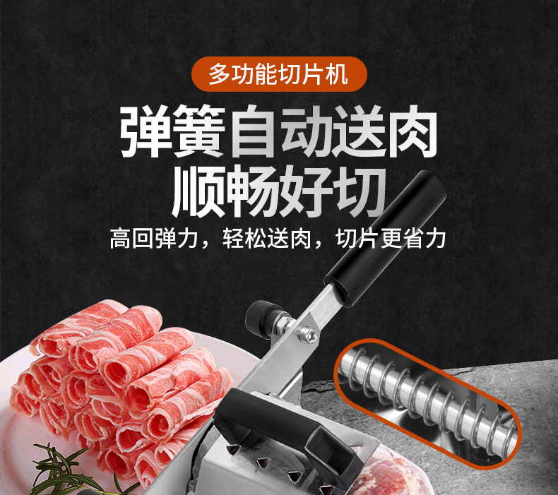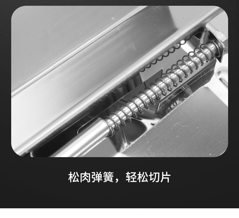 这款微力切片机受力处均为优质不锈钢制作,坚固耐用,切片省力,底部有高回弹弹簧,送肉安全省力,刀片可在0.3mm-8mm之间调节,可按照自己喜好切厚薄,单次打磨可连续切上百斤冻肉,刀片可持续打磨5次,中部V型托架,向下按压不变形,坚固固定不滑动。