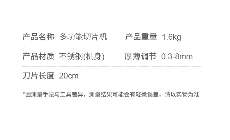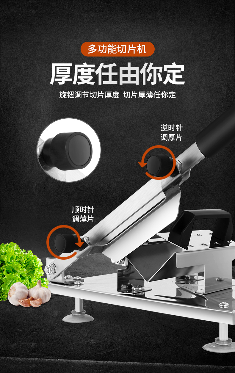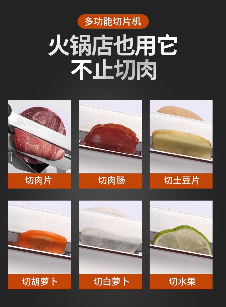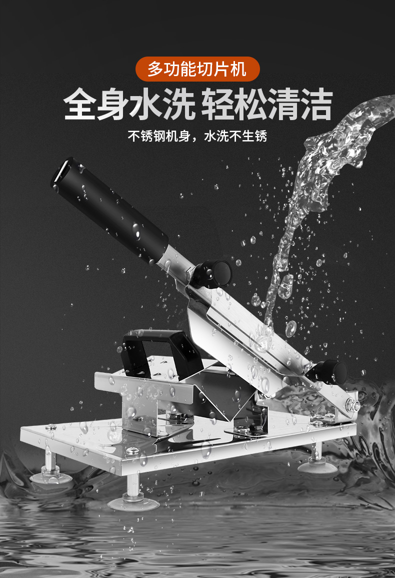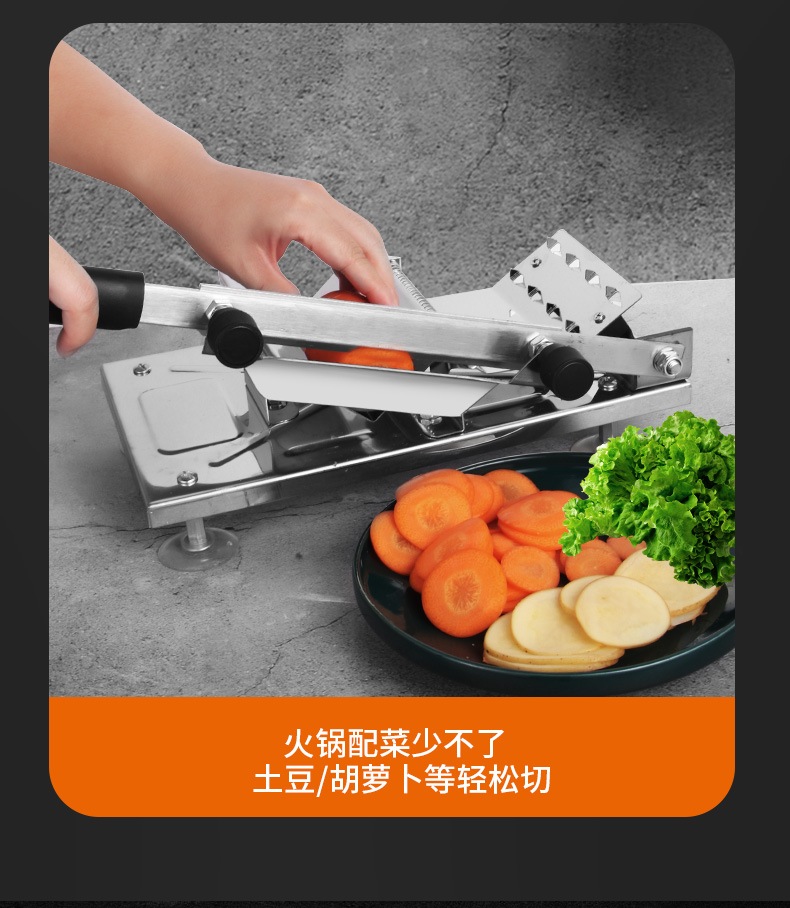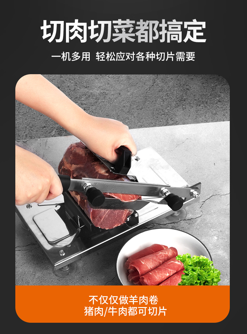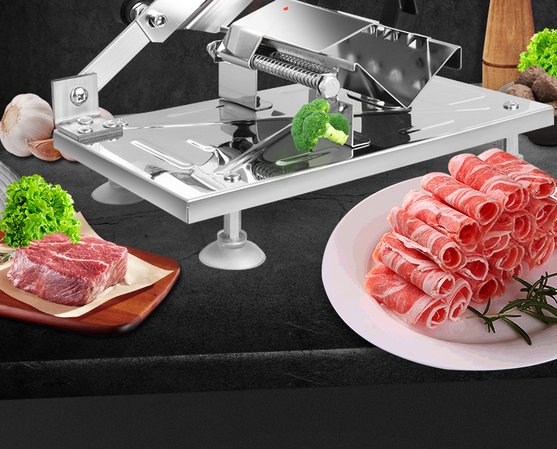 这款微力切片机受力处均为优质不锈钢制作,坚固耐用,切片省力,底部有高回弹弹簧,送肉安全省力,刀片可在0.3mm-8mm之间调节,可按照自己喜好切厚薄,单次打磨可连续切上百斤冻肉,刀片可持续打磨5次,中部V型托架,向下按压不变形,坚固固定不滑动。