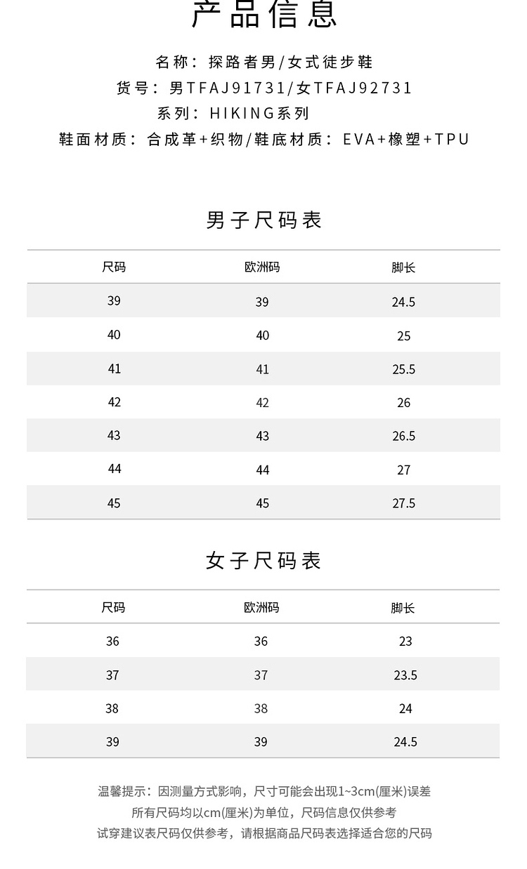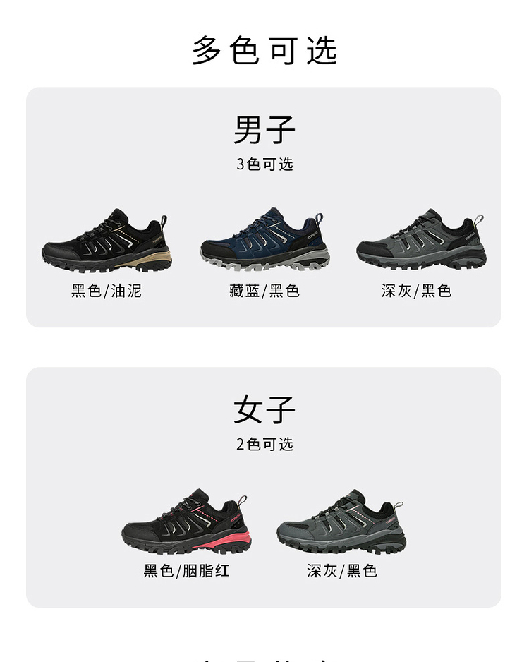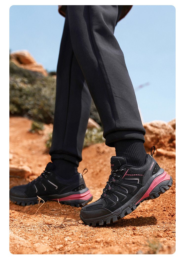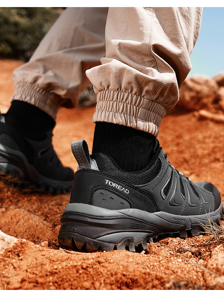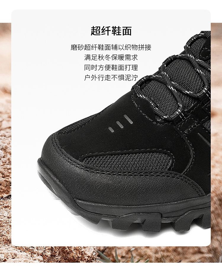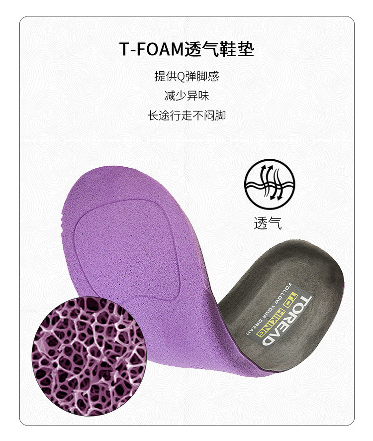 鞋面采用磨砂超纤辅以织物拼接,鞋头防踢撞设计,穿着舒适透气满足秋冬保暖需求,同时方便易打理,TOLITE轻量中底搭配T-FOAM透气鞋垫,速干减少异味,穿着轻盈舒适,双足踩棉感十足,长时间徒步也不觉劳累。鞋侧狼爪造型3M反光设计,提高夜间出行安全保障。