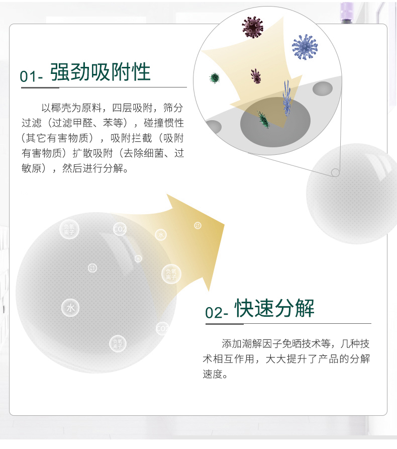 这款锐巢活性炭包,可主动锁定空气中的有害气体,碳表面会快速吸附甲醛分子加速甲醛分解,最后分解为二氧化碳和水。有效减少空气的有害气体。也可以放置在汽车内、卫浴等地,吸湿除味,净化空气。