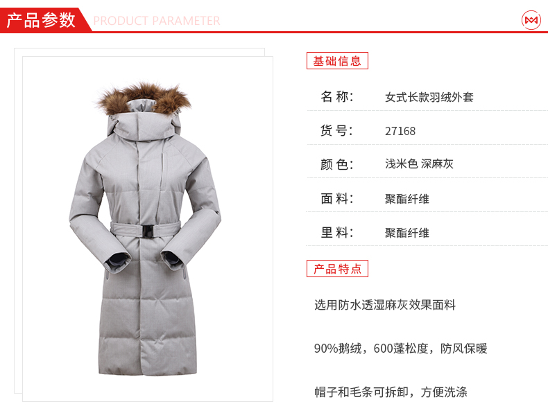 这款羽绒服是地球科学家2017年的高端款,修身收腰立体版型,下摆长度接近膝盖,女生上身效果非常好。在外层面料上,使用防水透湿耐磨的冲锋衣面料,近乎100%防雨、100%防风,还拥有良好的透气性,增强了防护效果,冷风不易吹透。