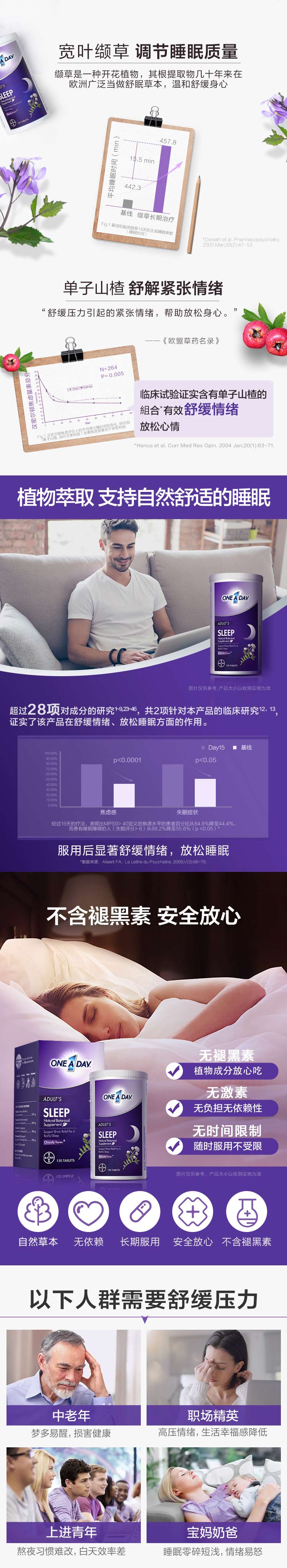 这款One A Day 舒压睡眠片,美国原产,自然萃取植物成分配方,西番莲果提取物、黑夏至草提取物、单子山楂提取物、缬草提取物,无激素、无依赖,可长期食用。