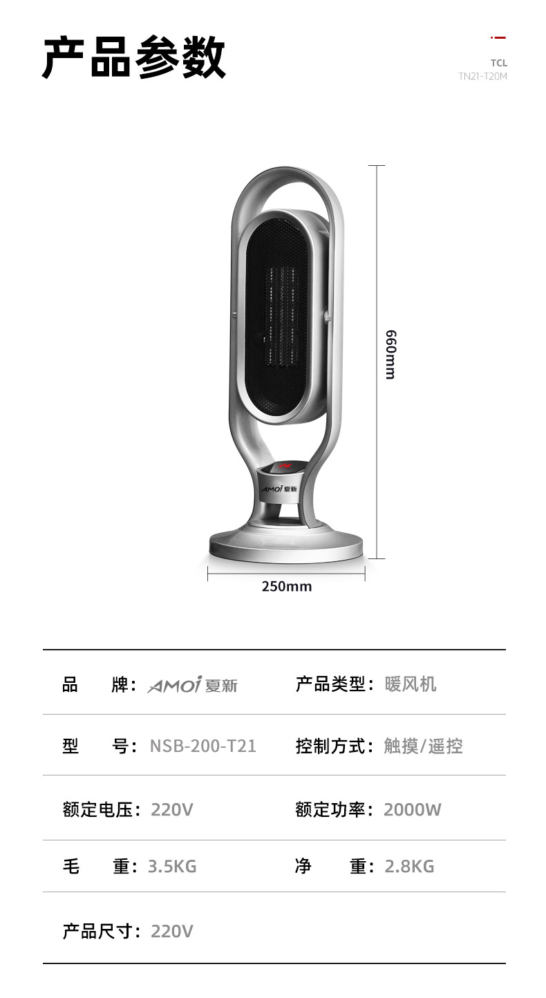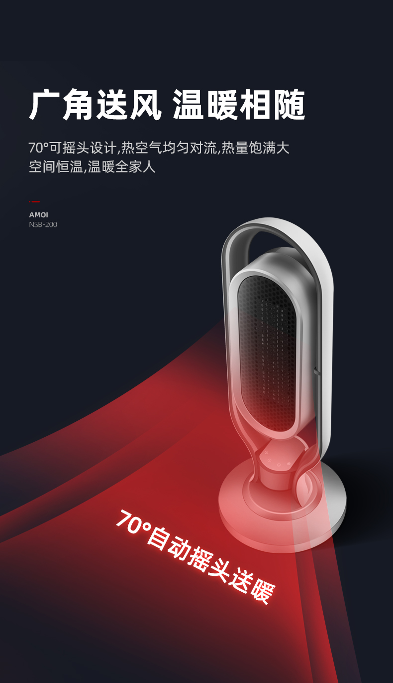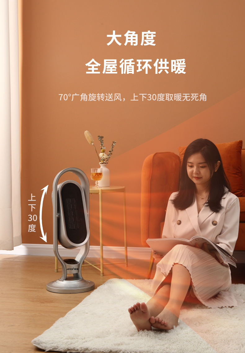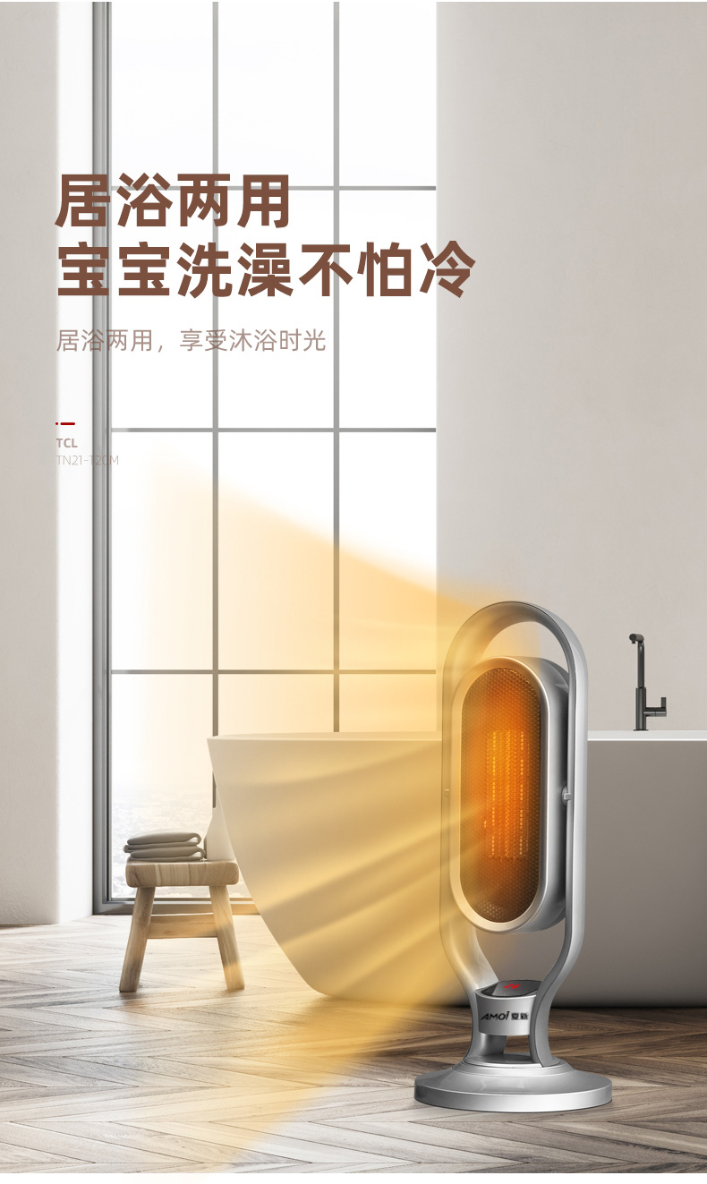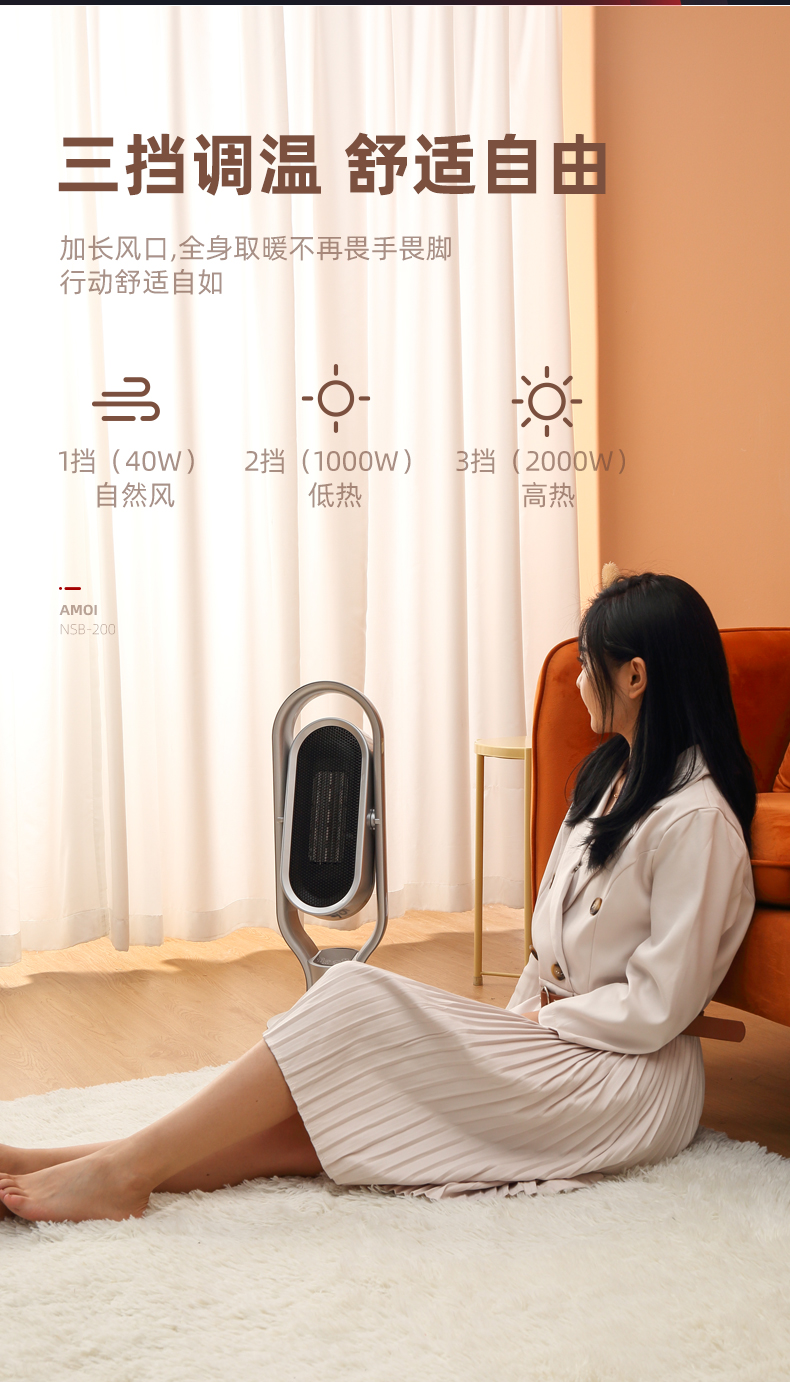 这款2000W立式电热风机,采用TPC陶瓷发热,即开即热,冷暖两用三档调节(1档40w自然风、2档1000w低热,2000w高热),可上下30度、左右70度广角摇头送风,热空气均匀对流,空间恒温,温暖全家,可居浴两用,具有倾倒断电、过热断电、防烫金属网、底盘加固不易倾倒等一系列保护措施,使用安全放心。
