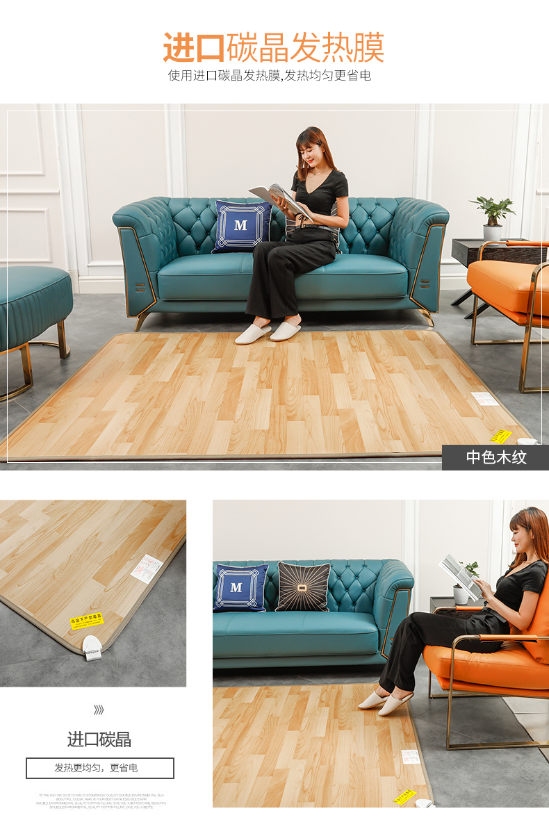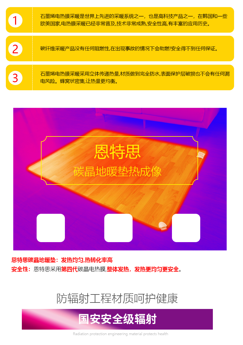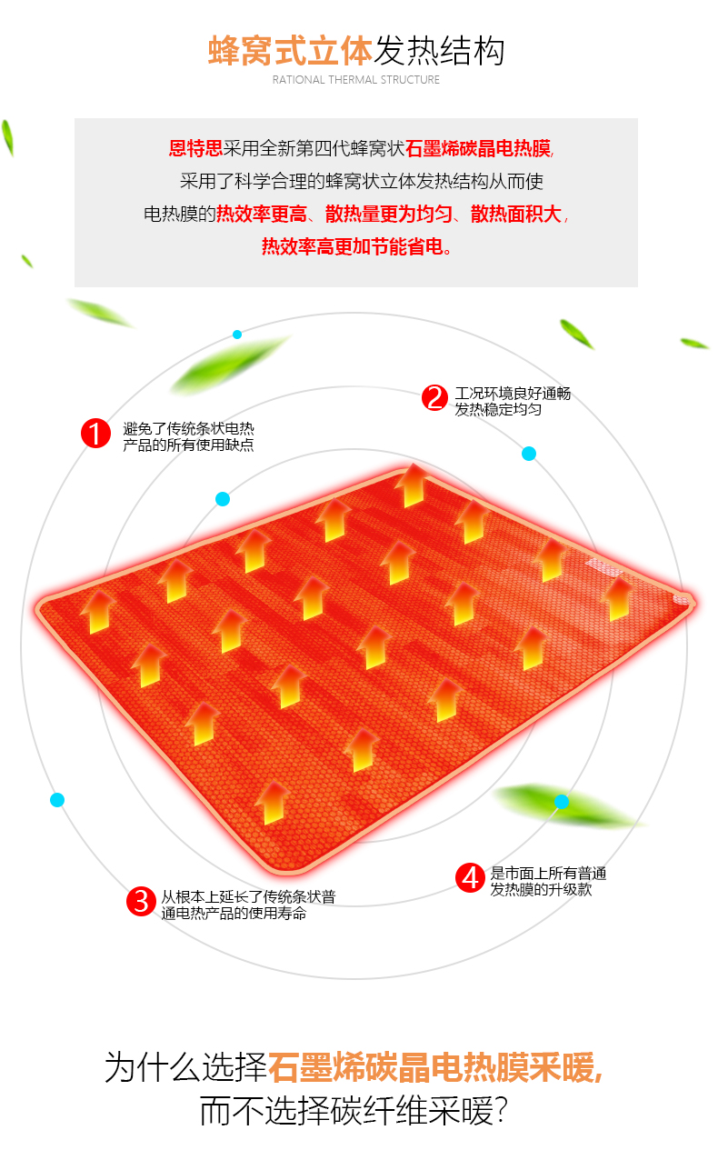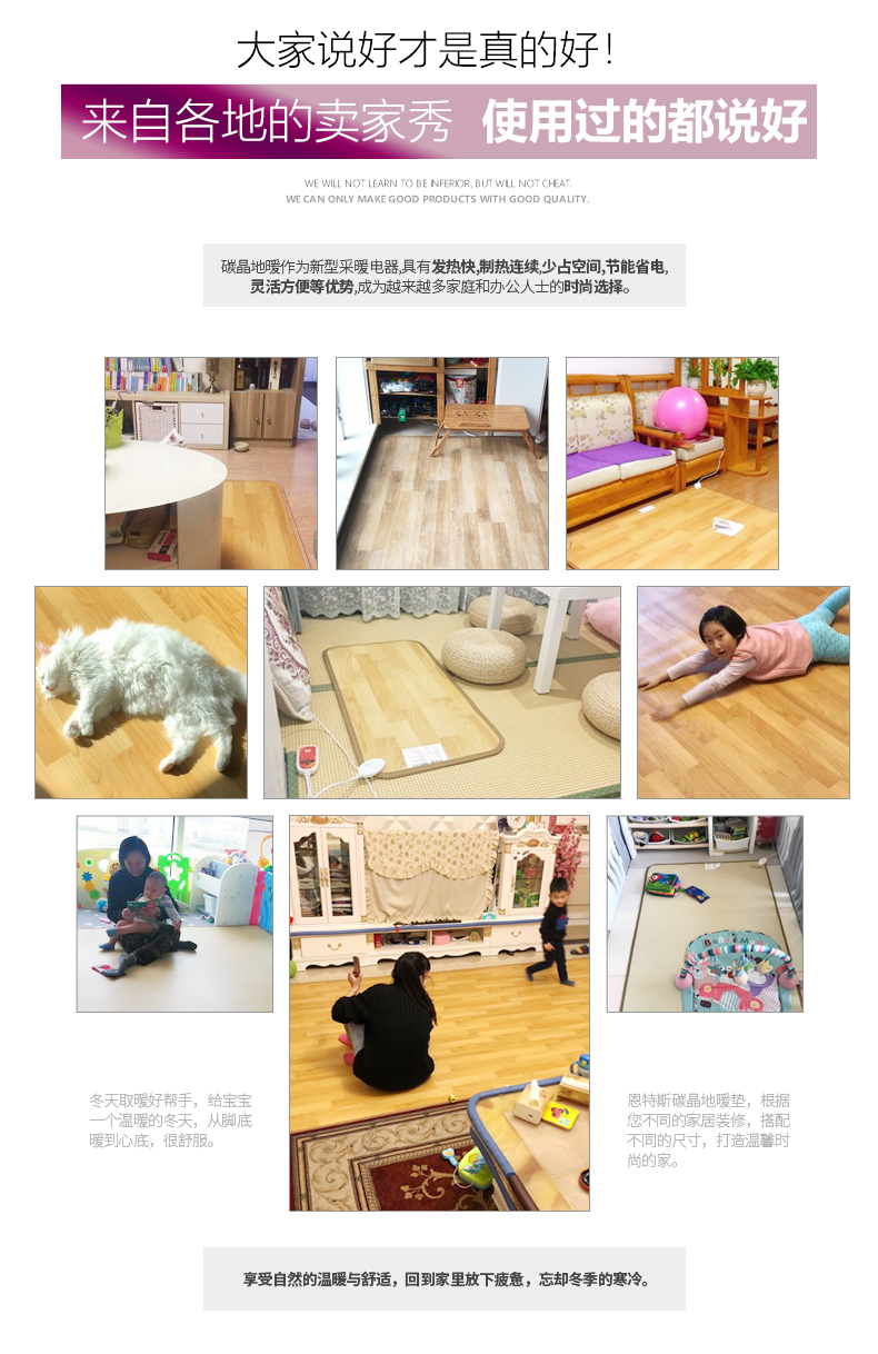 这款恩特思 碳晶地暖垫,采用韩国进口的第四代升级碳晶电热膜,无导入电流区域设计,可以整垫整体发热,电热毯四周2-3cm没有铺设发热膜,特有的留边设计,以便更合理排布内部结构;10-60℃的自动控温,自由调节。