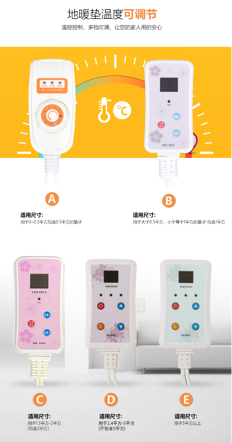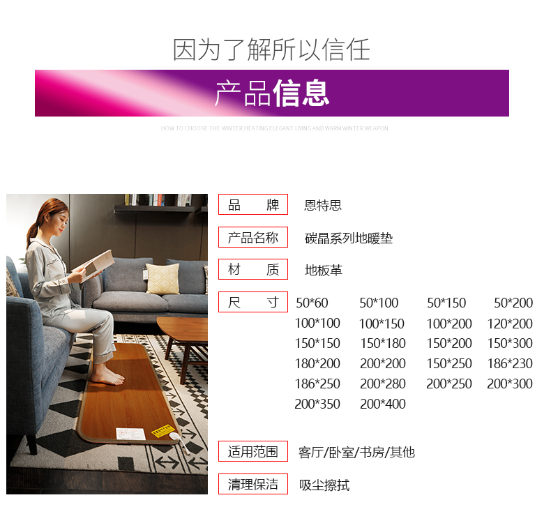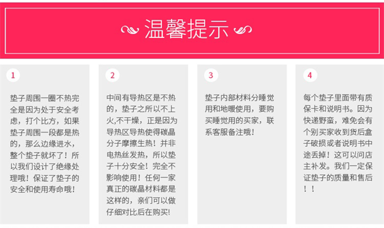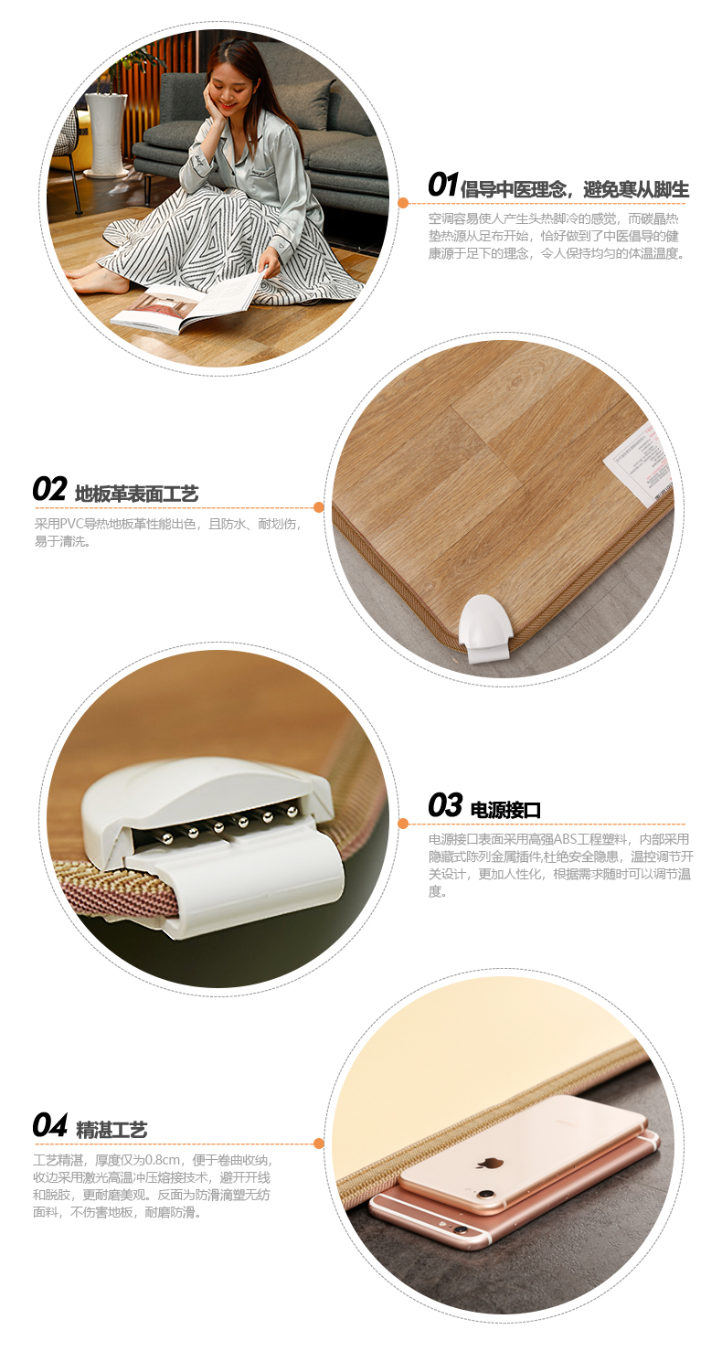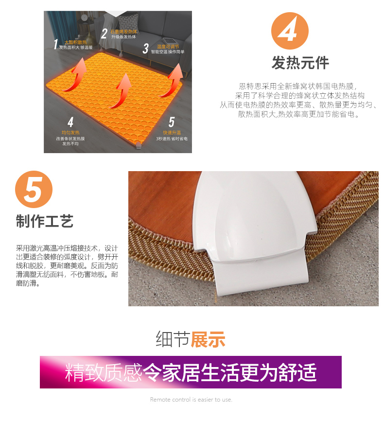 这款恩特思 碳晶地暖垫,采用韩国进口的第四代升级碳晶电热膜,无导入电流区域设计,可以整垫整体发热,电热毯四周2-3cm没有铺设发热膜,特有的留边设计,以便更合理排布内部结构;10-60℃的自动控温,自由调节。