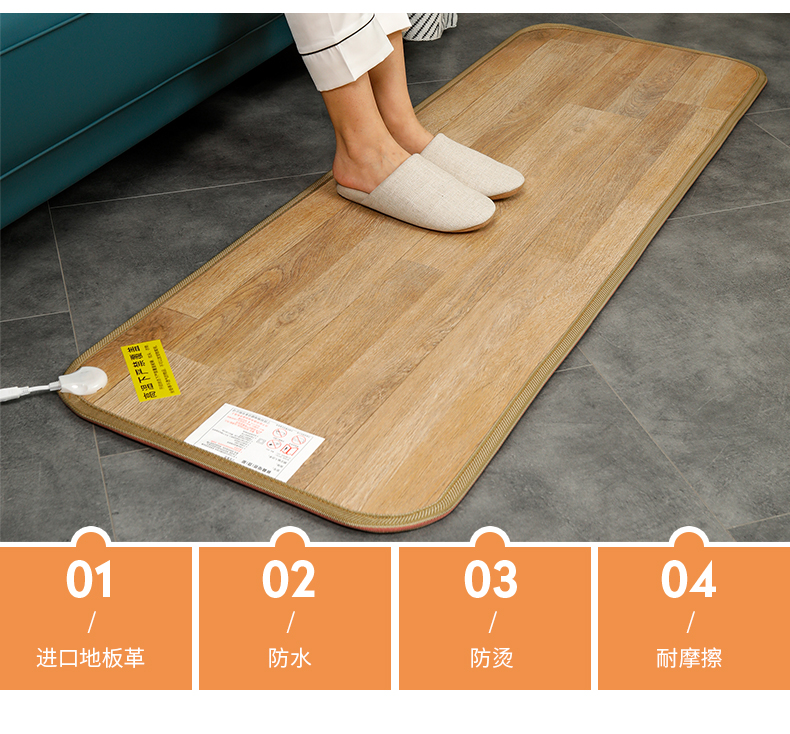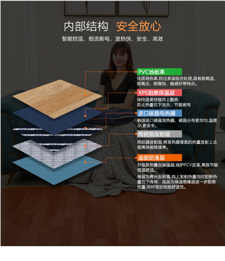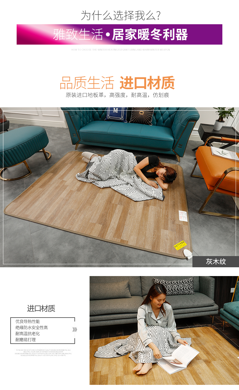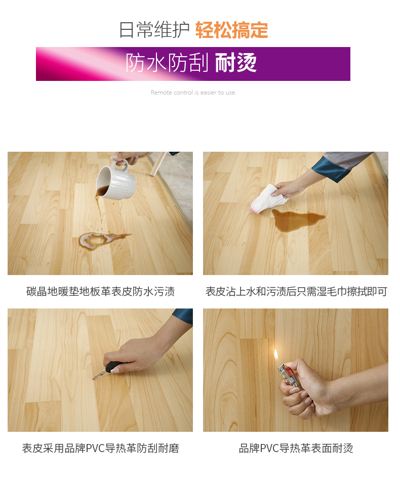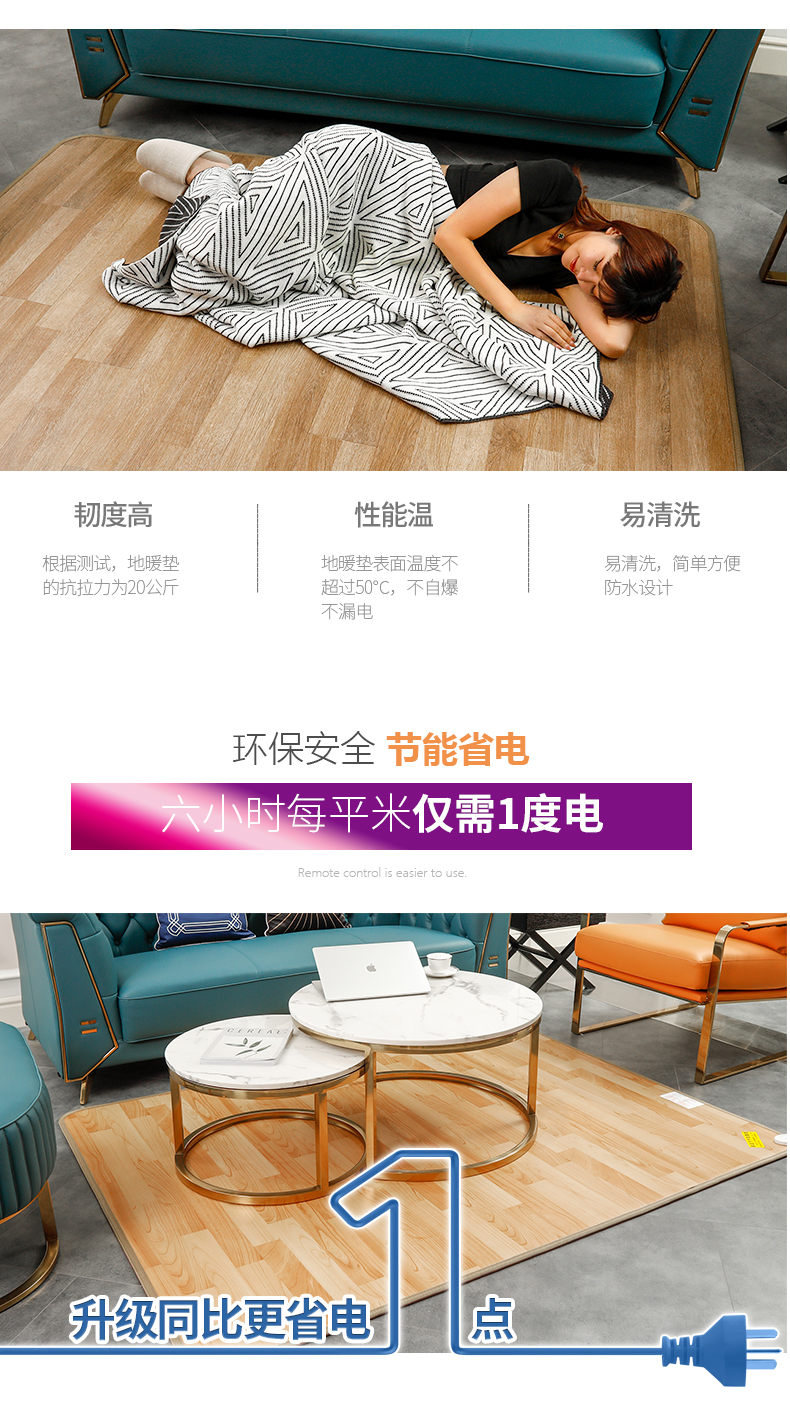 地暖垫采用多层防水阻燃隔热材料制成,立体全面加温,发热均匀更省电,升温只需2秒迅速不干燥;表层是阻水阻燃材质,安全无毒 ;内部还有85℃过热温度保护装置,超过85℃自动断电,防止温度过高起火;温控器自带12小时自动断电保护功能,连续使用超过12小时,自动断电。