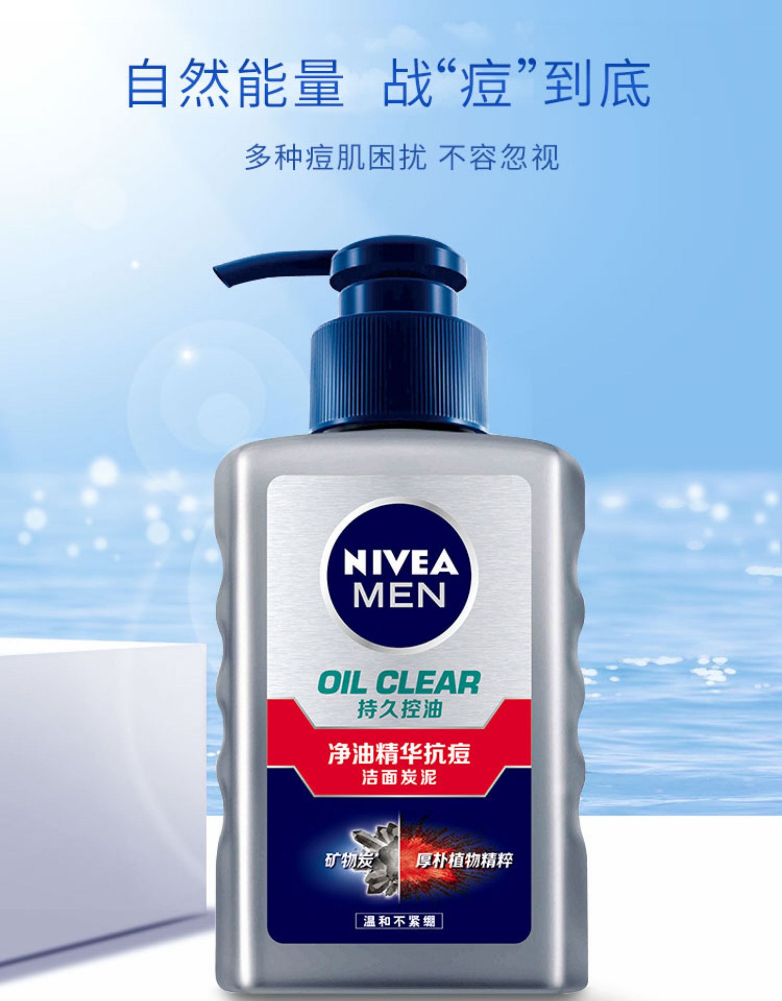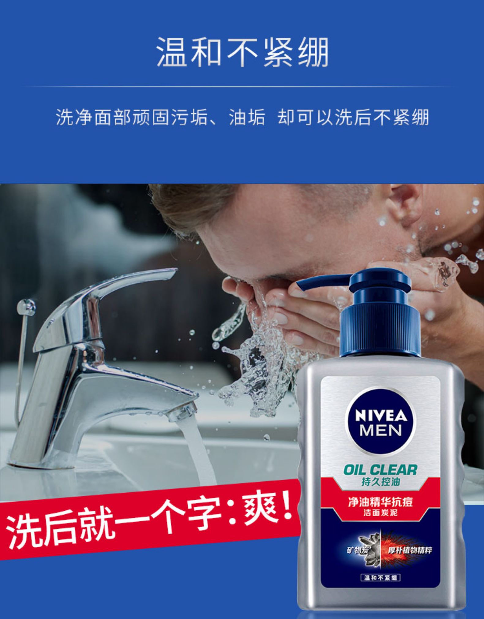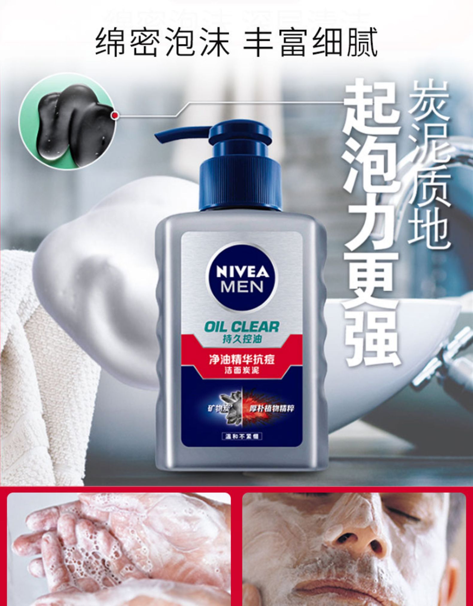 妮维雅男士精油精华抗痘洁面炭泥,尤其适合油性肌荐,能深层清洁,清爽补水易吸收,水平两平衡。专为男性肌肤设计,注入大量水分,密集保湿,提供长时间持久滋润。