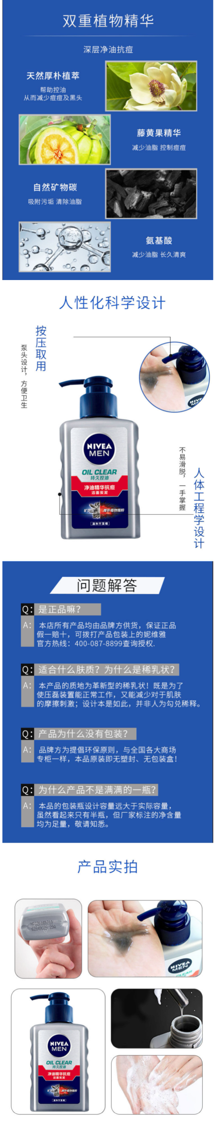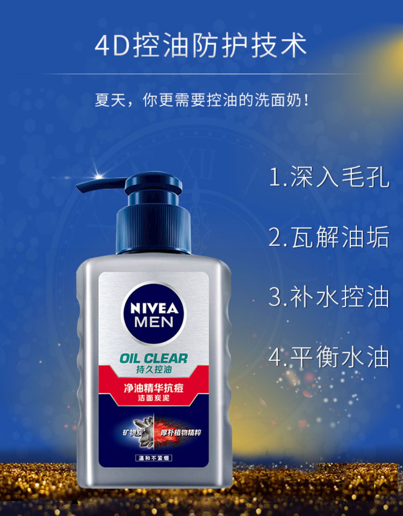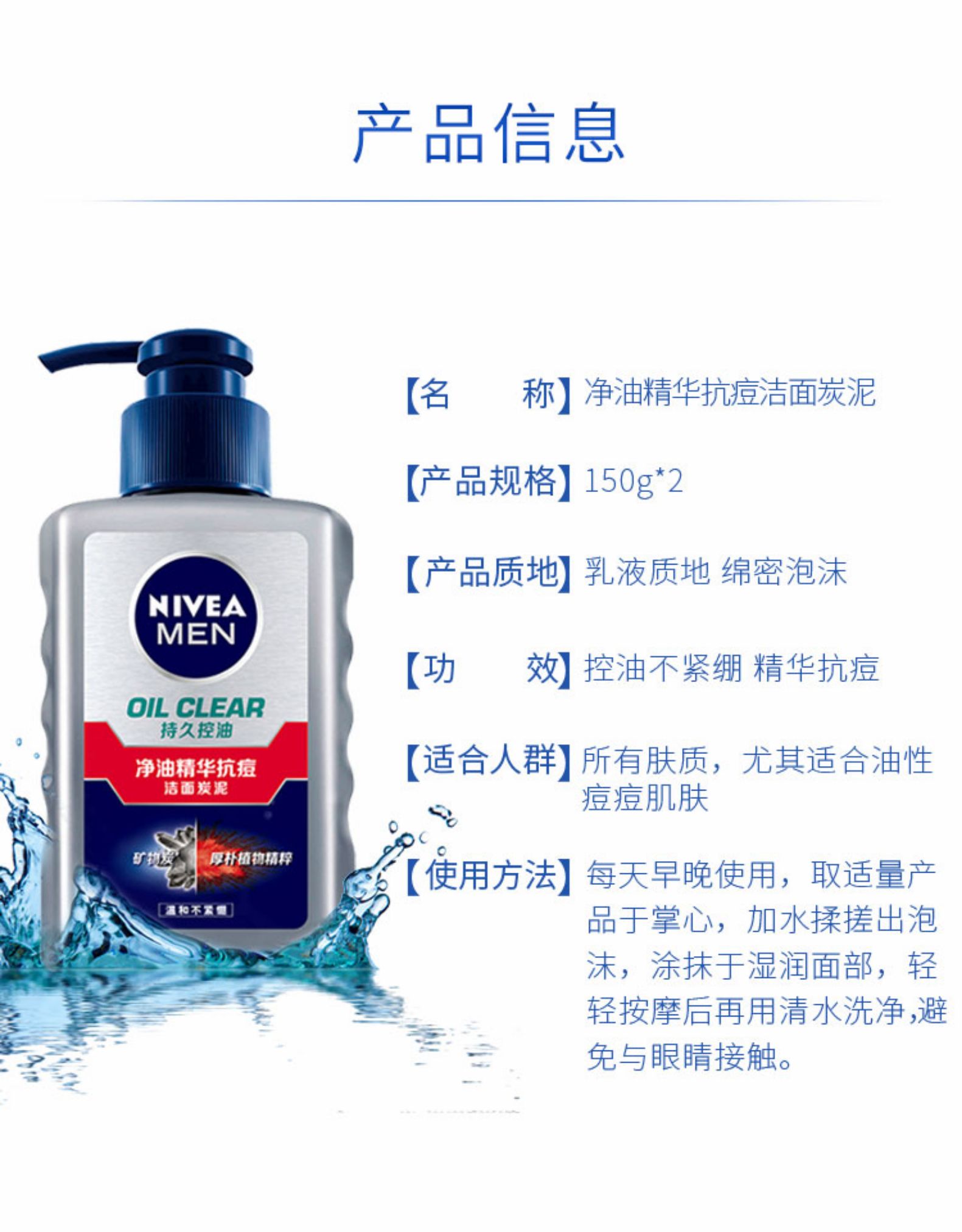 妮维雅男士精油精华抗痘洁面炭泥,尤其适合油性肌荐,能深层清洁,清爽补水易吸收,水平两平衡。专为男性肌肤设计,注入大量水分,密集保湿,提供长时间持久滋润。