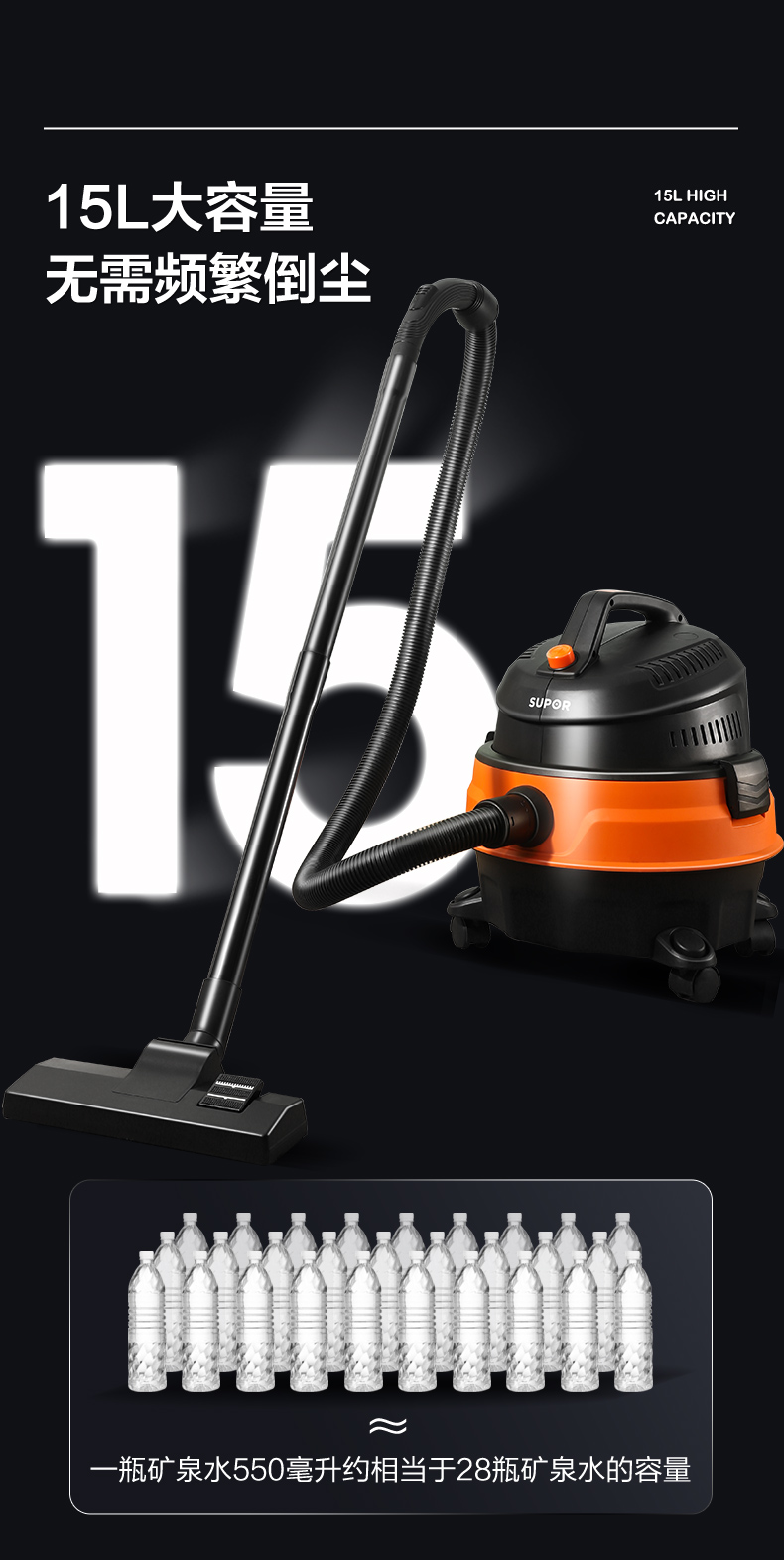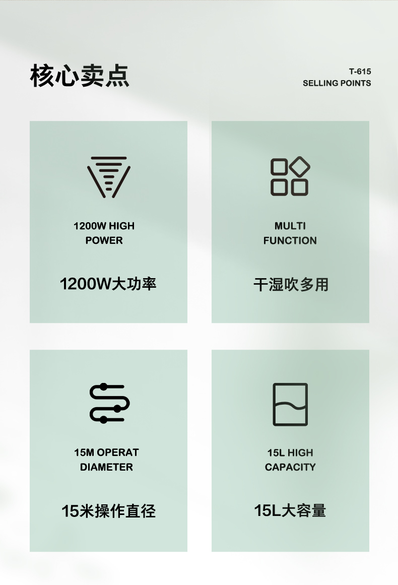 IPX4级全身防水,防触电,安全性高。15L大容量存储,约等于30瓶矿泉水,无需多次清理,5重精细过滤,避免造成2次污染。15m操作直径,不用来回换插座,操作简单。同步热风除湿,洁净干爽。