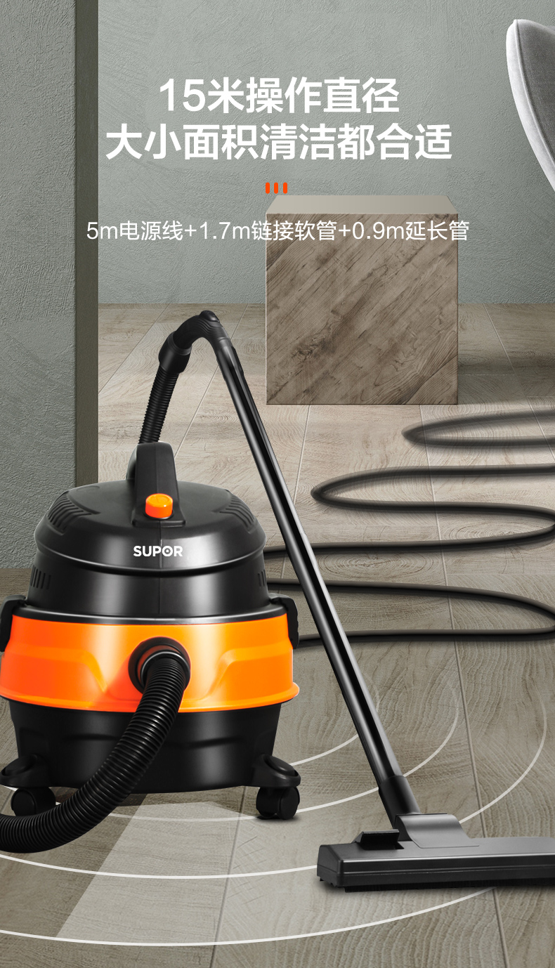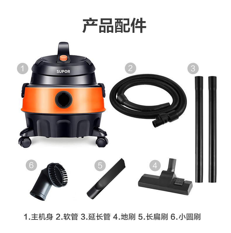 苏泊尔出品大吸力吸尘器,干湿吹三用,配备4种原装吸口,1200w大吸力,可以轻松吸扁水桶,实测噪音值75分贝,和正常说话时分贝差不多,一机搞定装地毯、沙发、浴室积水、厨房垃圾、装修垃圾等等。