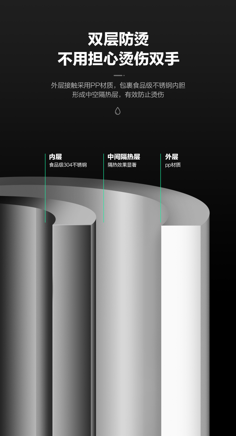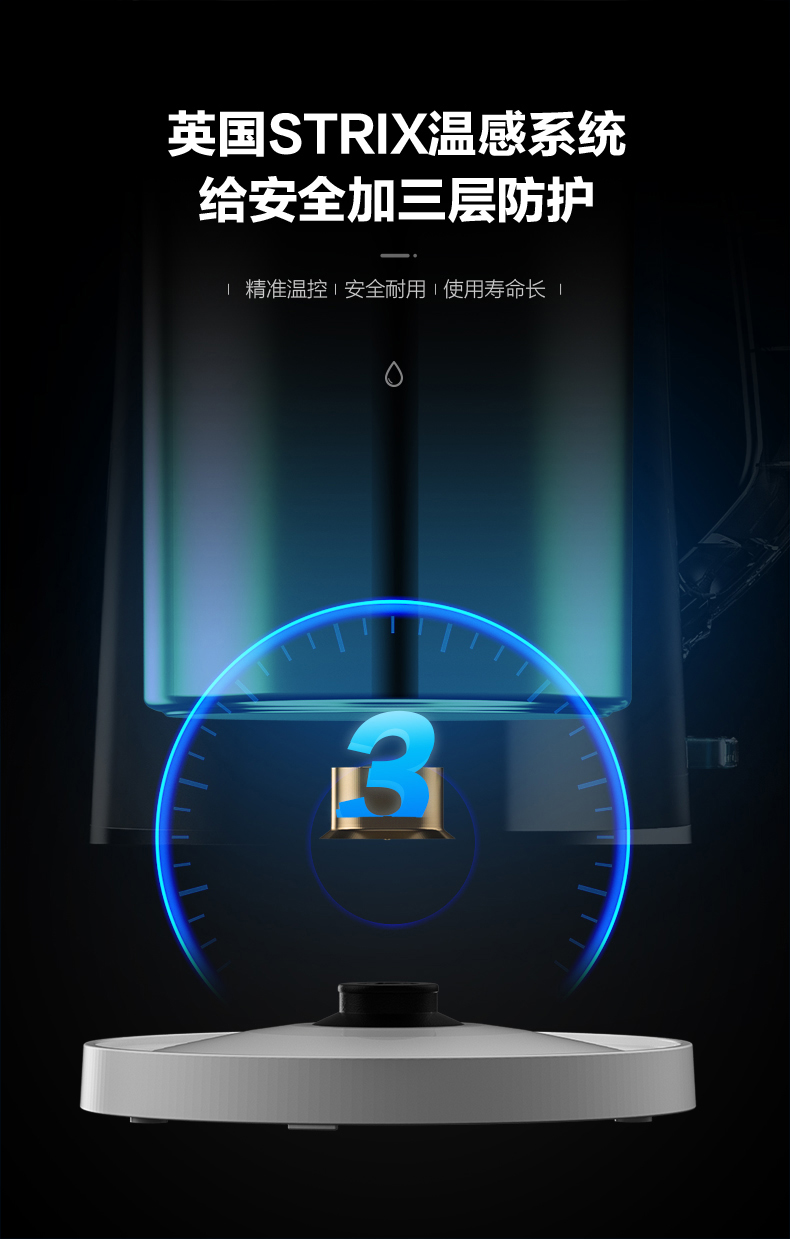 外层是接触PP材质,中间是中空隔热层,有效防止烫伤。壶盖顶部有防溅聚水环,加速了水滴回落,防止开盖时飞溅。英国Strix温控精准控温,水开自动断电,防干烧。