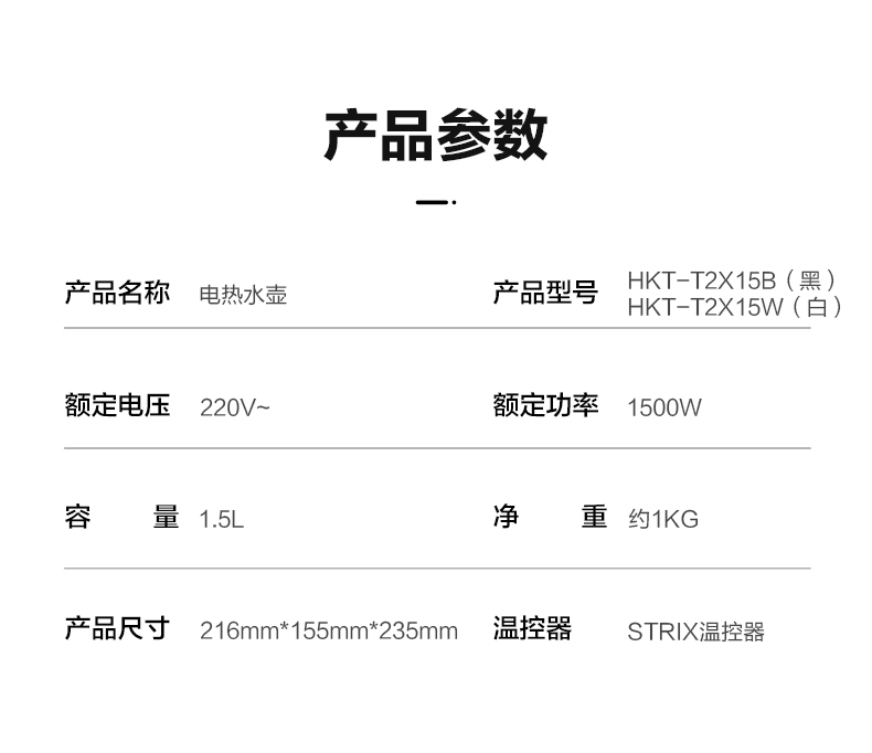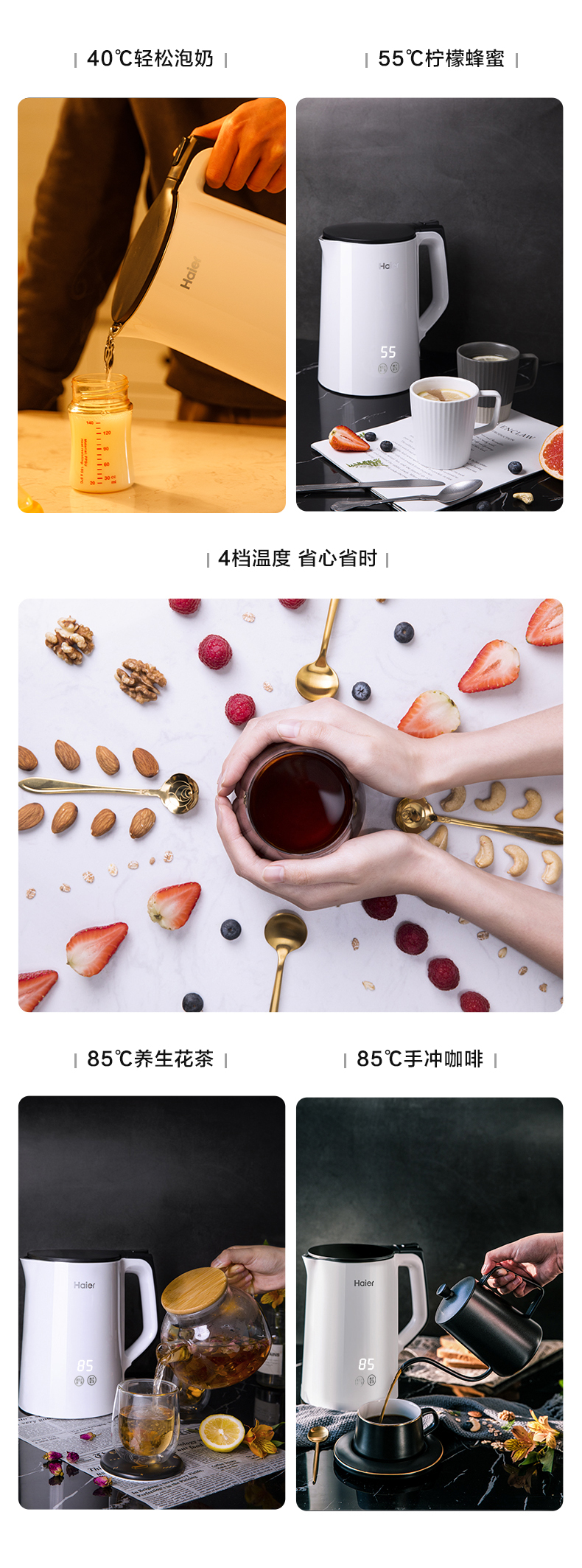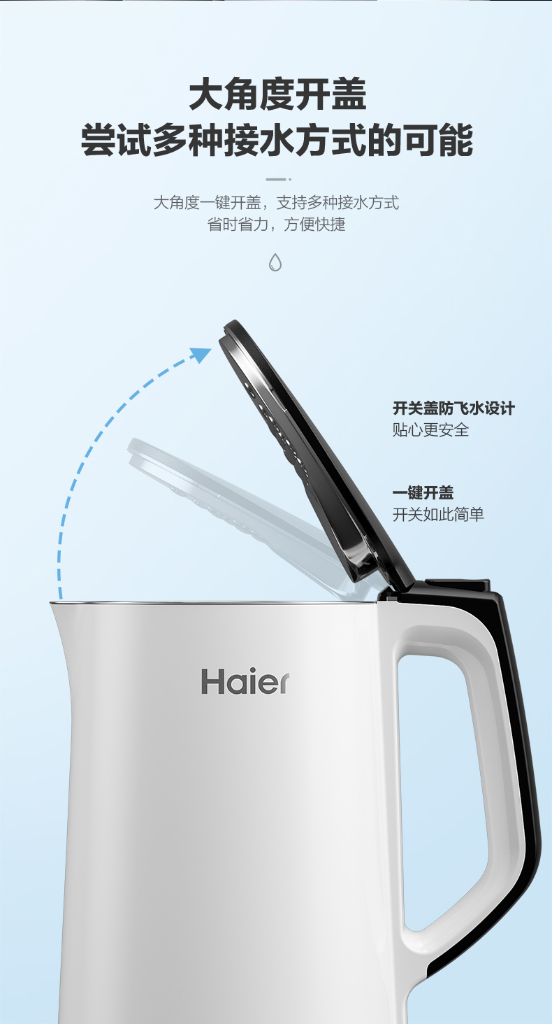 这款海尔双层防烫电热水壶,容量是1.5L,功率是2200W,与水接触的所有部位都是304不锈钢制成,安全无毒,一体化无缝内胆,不藏水垢,易清洗。