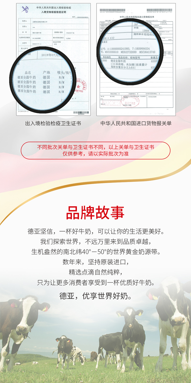 德亚牛奶由德国知名奶产品厂商Hochwald 好沃德代工生产,商品拥有国家颁发的“出入境检验检疫卫生证书”和“中国人民共和国进口货物报关单”。