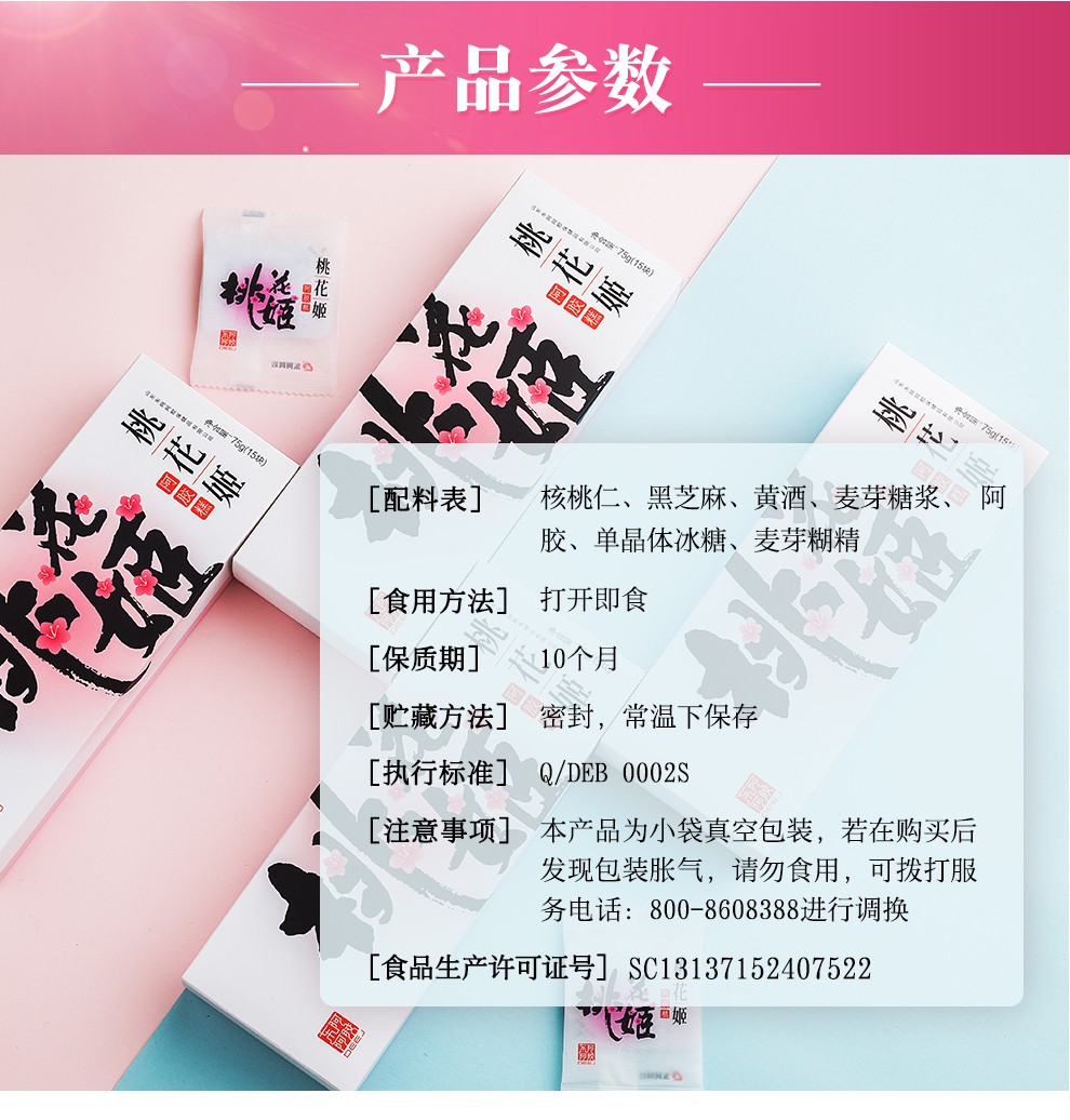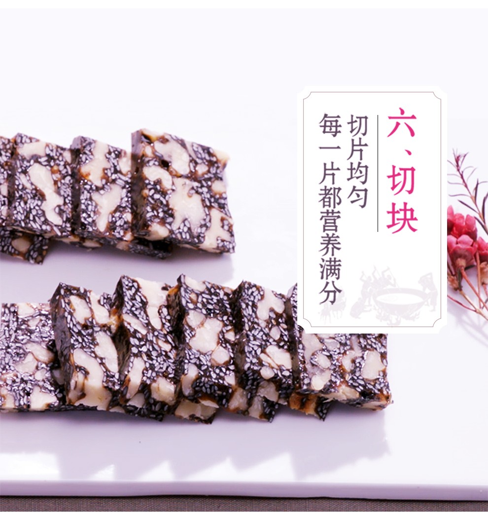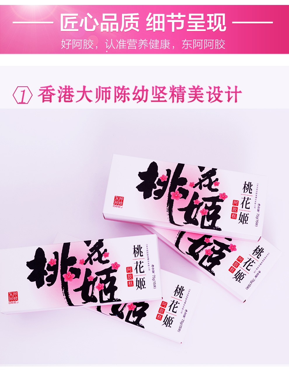 桃花姬阿胶糕由上等东阿阿胶、黑芝麻、绍酒、核桃仁、冰糖等配制而成,富含蛋白质和多种氨基酸、微量元素,营养丰富,方便可口。通过加入核桃、黑芝麻等原料,核桃的香脆和芝麻的浓香渗入琥珀色的阿胶中,入口带有淡淡清香。主要用于滋阴养血、润燥、美容养颜、增强免疫力。