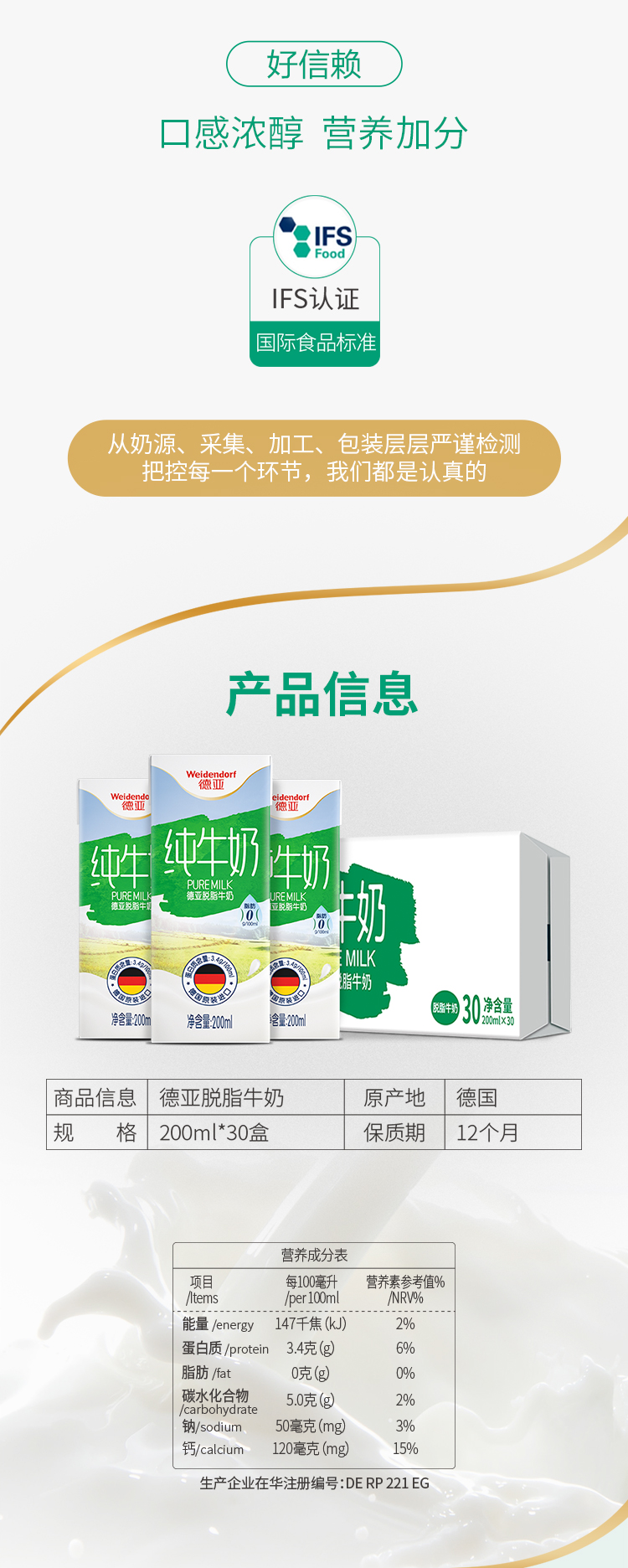 Weidendorf德亚是品利公司的自有品牌,是一家正规的进口食品进口商和经销商,其奶源采自澳大利亚和德国两地。德亚牛奶由德国知名奶产品厂商Hochwald 好沃德代工生产,商品拥有国家颁发的“出入境检验检疫卫生证书”和“中国人民共和国进口货物报关单”。