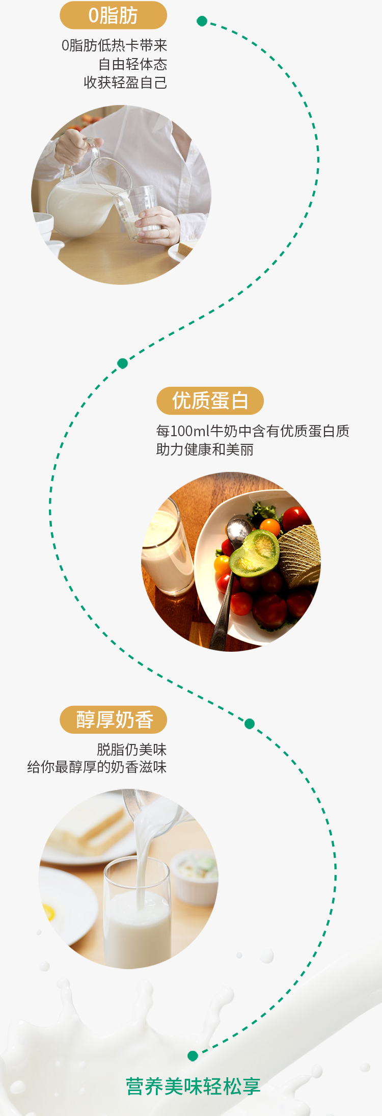 每100g牛奶中含能量 147kj(2%)、蛋白质3.4g(6%)、脂肪0(0%)、碳水化合物5.0g(2%)、钠50mg(3%)、钙120mg(15%)。