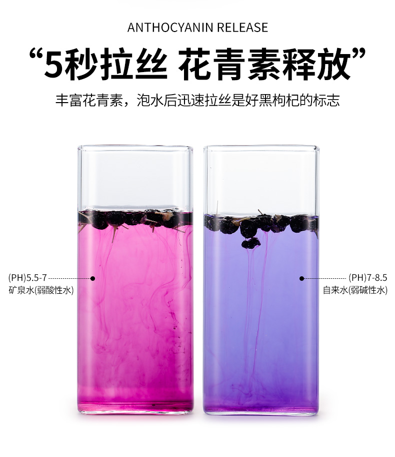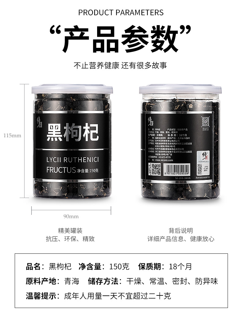 野生黑枸杞味甘、性平,富含蛋白质、脂肪、糖类、游离氨基酸、有机酸、矿物质等多种有机成分,其钙、铁、尼克酸含量分别为红果枸杞的2.3、4.6、16.7倍,尤其是原花青素超过蓝莓(这是迄今为止发现原花青素含量最高的天然野生果实,也是最有效的天然抗氧化剂。