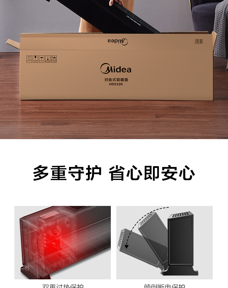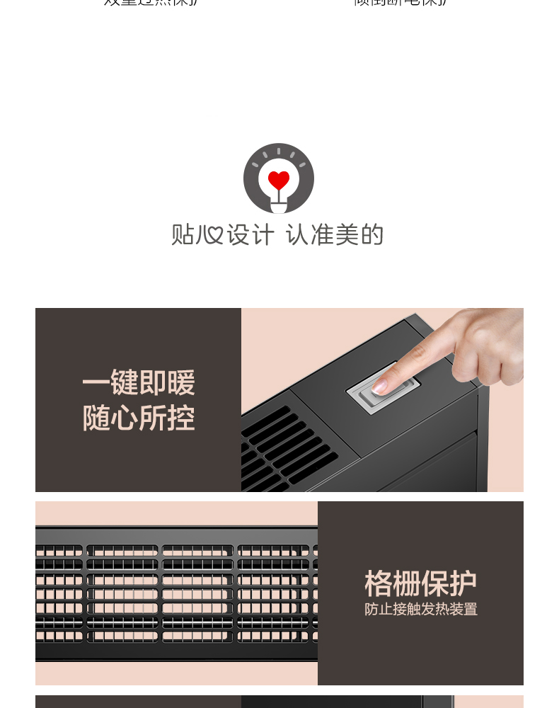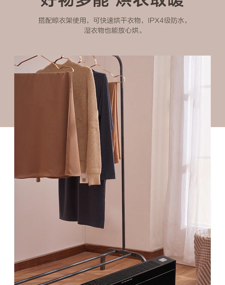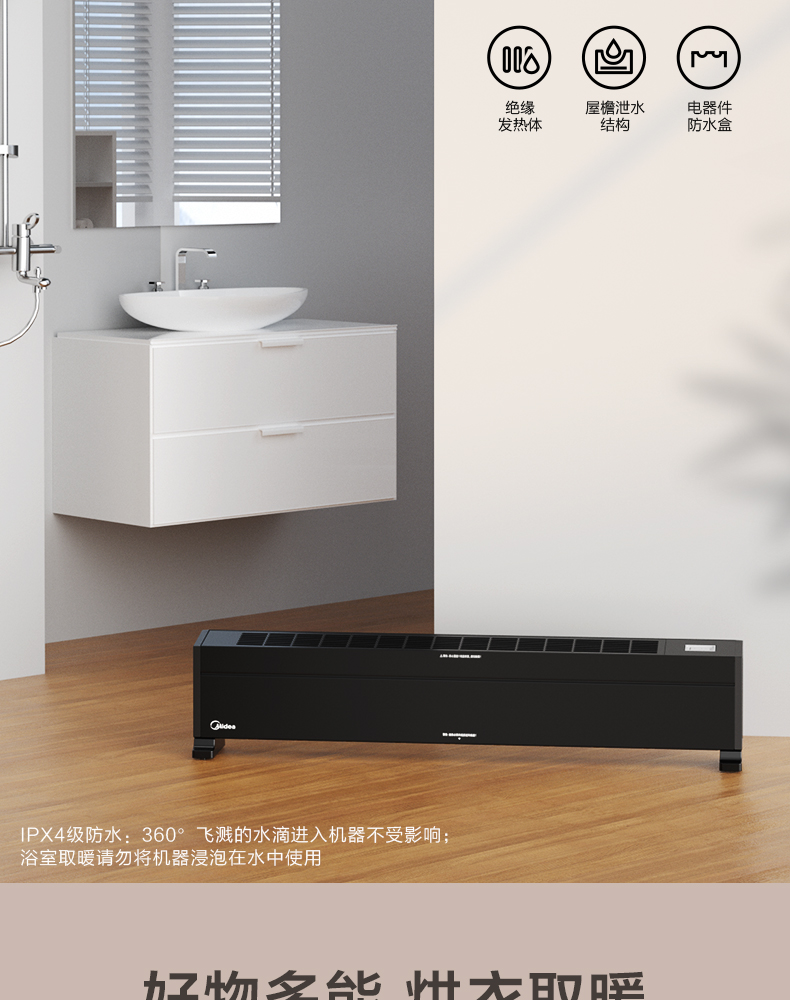 细节上:绝缘发热体+屋檐泄水结构+电器件防水设计,共三重防水结构,IP24防水等级可放心在浴室使用,搭配晾衣架可快速烘干衣物,一机多用,一体式免安装,开箱即用,非常方便,具有倾倒断电,过热断电保护,使用安全有保障。
