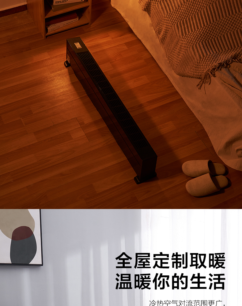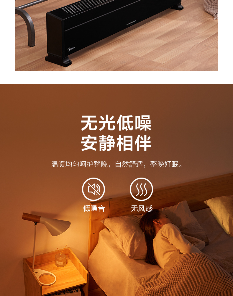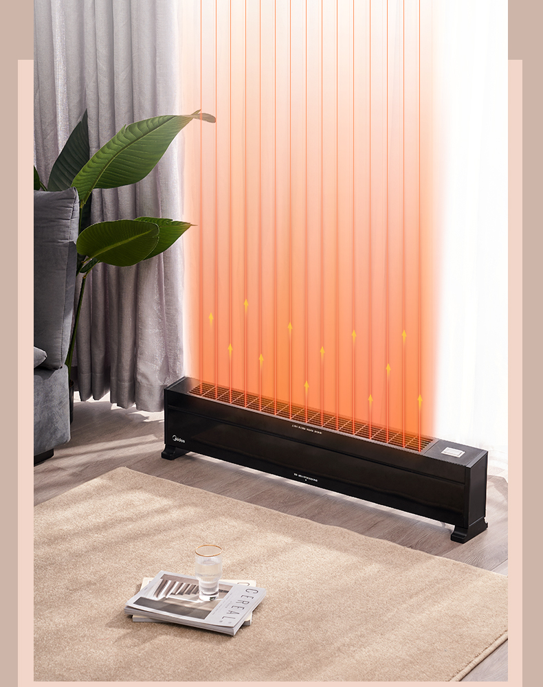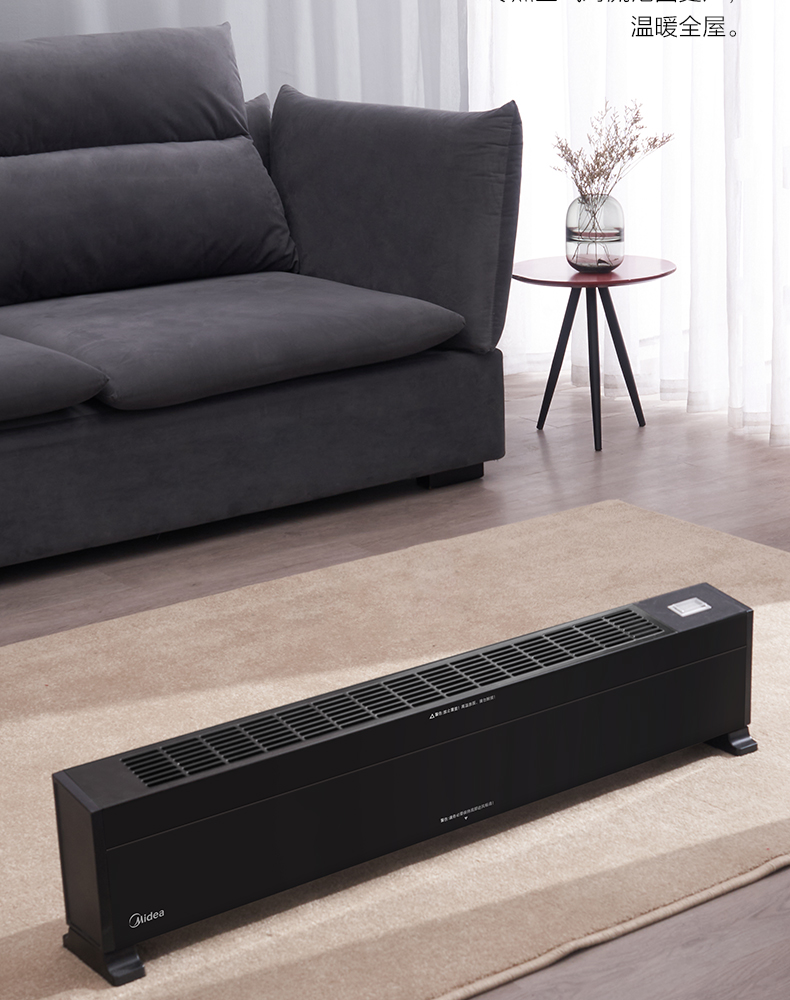 Midea美的家用踢脚线取暖器,无光、无噪、无风感、自然舒适,整晚好眠,采用860mm加长铝合金翅片发热体,启动后自动生成热能屏障墙,隔绝冷空气,室内整体均匀升温,较老款热效率提升30%。