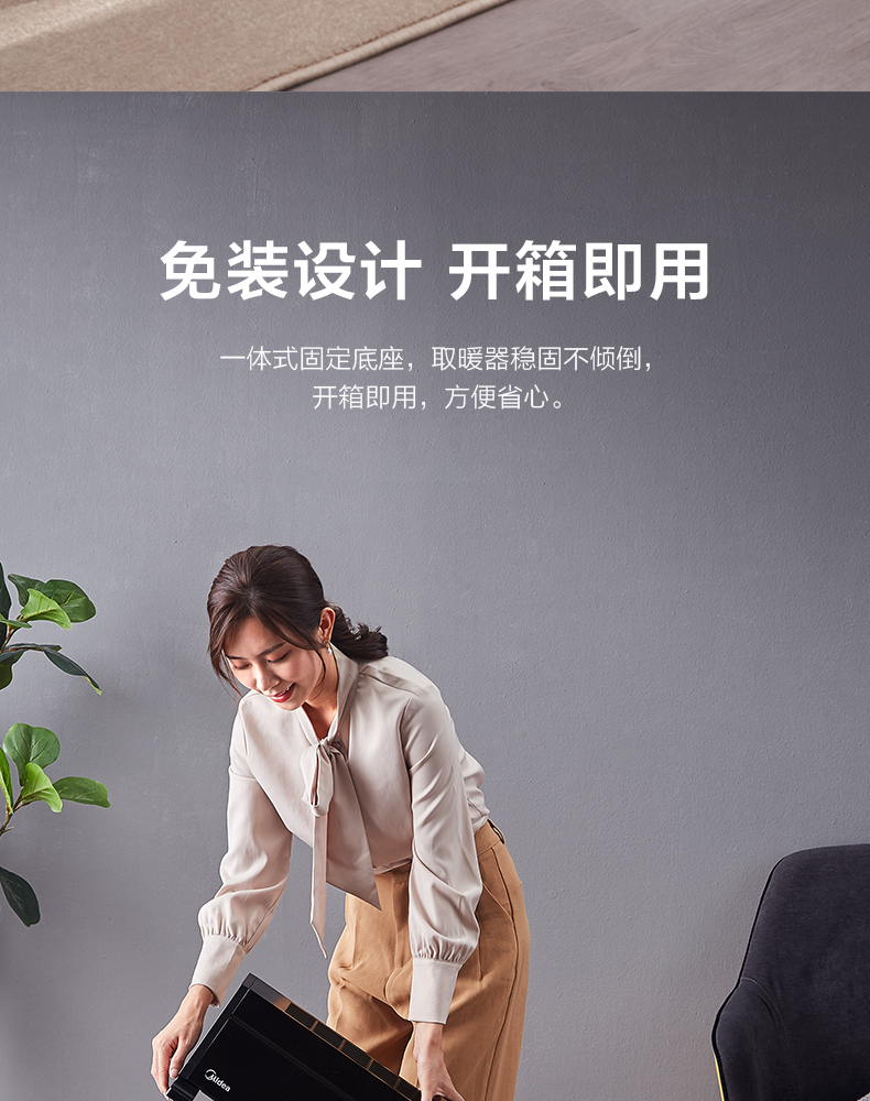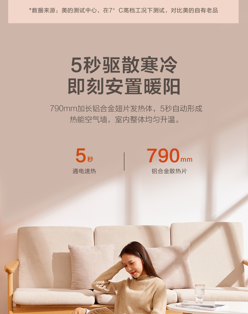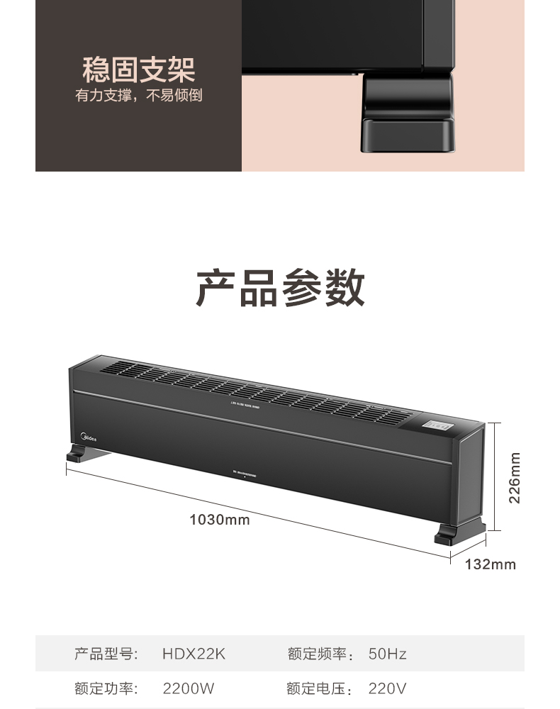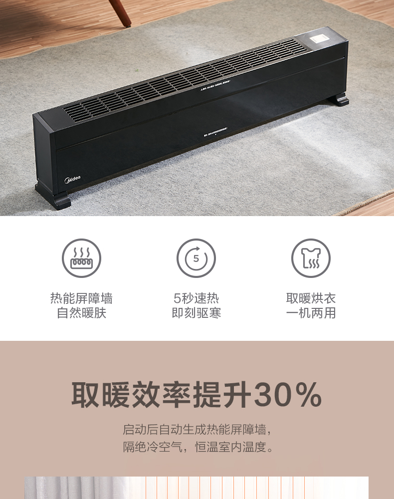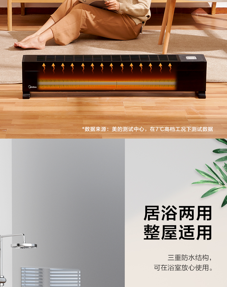 Midea美的家用踢脚线取暖器,无光、无噪、无风感、自然舒适,整晚好眠,采用860mm加长铝合金翅片发热体,启动后自动生成热能屏障墙,隔绝冷空气,室内整体均匀升温,较老款热效率提升30%。