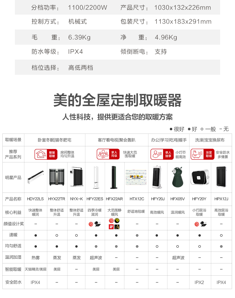 尺寸:1030*132*226mm、净重4.96kg、防水等级IPX4、1100W/2200W两档可调.