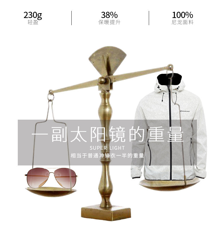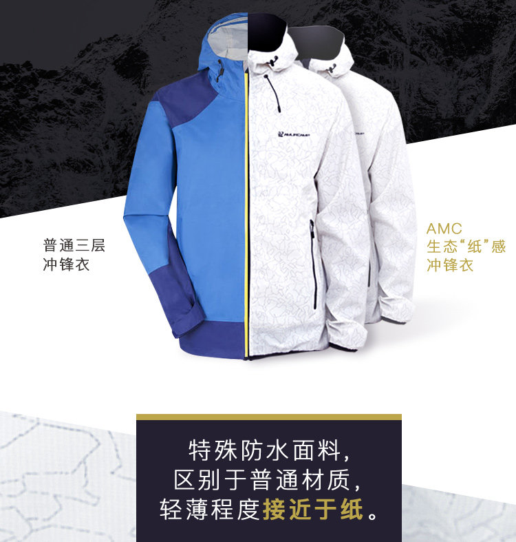 Amurcamp纸感系列冲锋衣,防水指数10000mm可防暴雨,直接当雨衣穿,透湿指数高达10000g激烈运动可穿;使用新颖的纸感面料,轻薄程度接近于纸,把冲锋衣的功能做到轻型风衣的重量,230克重量不到传统冲锋衣的一半。还拥有UPF 50+的50倍防晒功能。