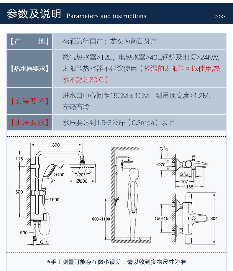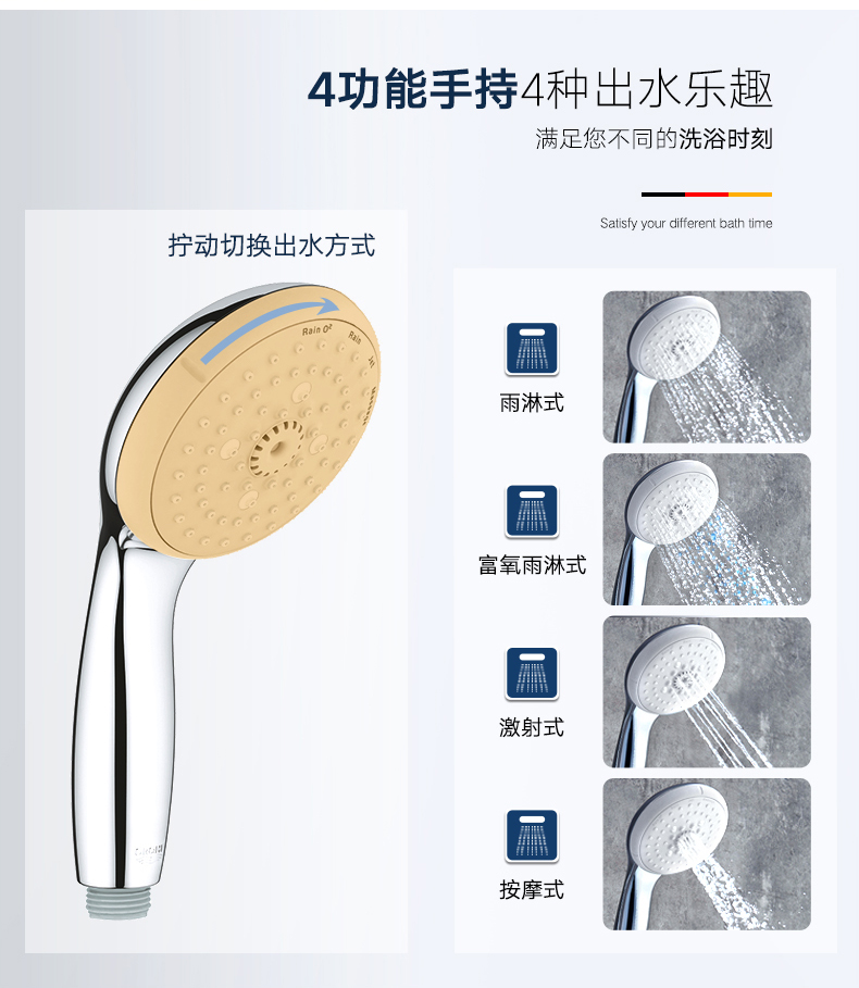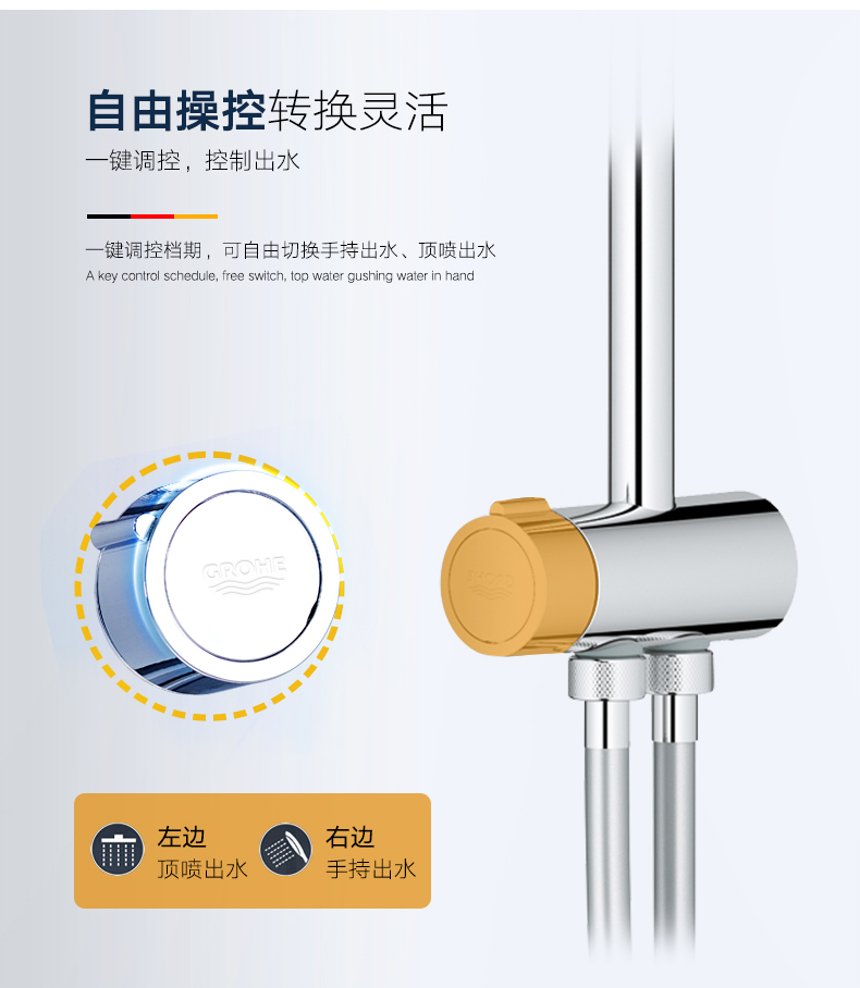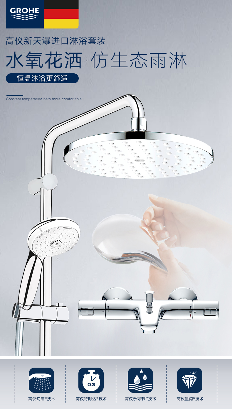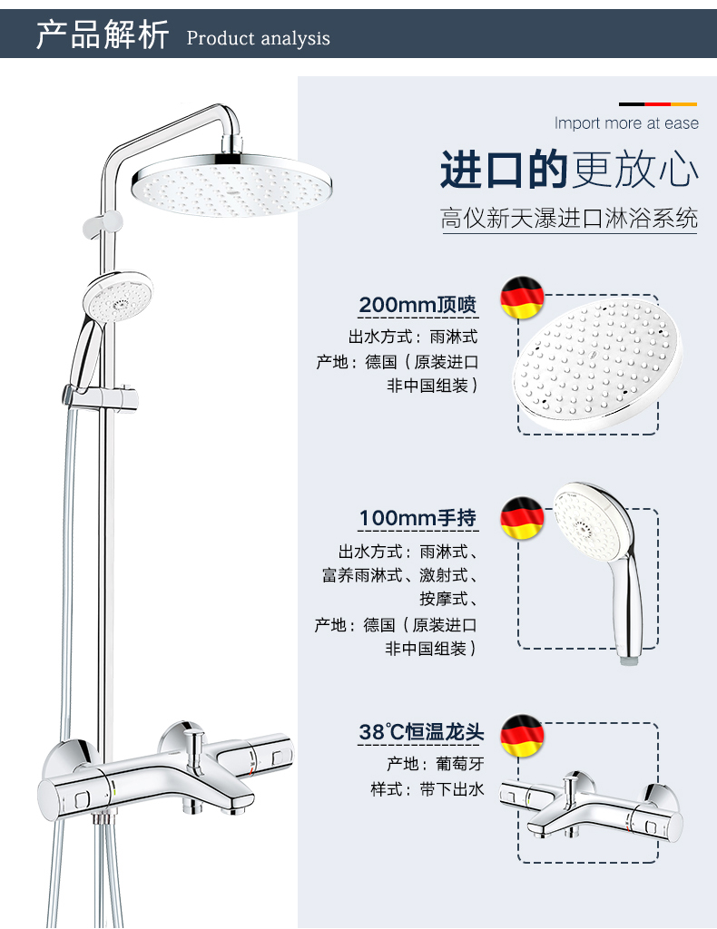 高仪这套淋浴花洒是三出水(花洒+顶喷+龙头下出水),其中淋浴系统是高仪德国海默工厂生产,带有空气注入技术,花洒表层硅胶是德国巴斯夫生产,带自清洁系统,用手指拨动出水口,就可清洁污垢。恒温龙头是葡萄牙生产,使用高仪闻名的特时达技术,可在0.3秒内混水达到预设问题,龙头下水器带起泡器,不易飞溅。