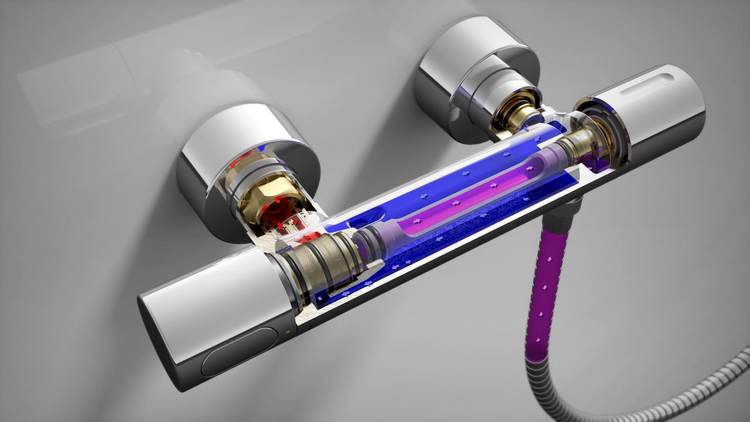 恒温花洒靠阀芯自动混水,阀芯有「石蜡」和「记忆金属弹簧(也叫SMA弹簧)」两种。