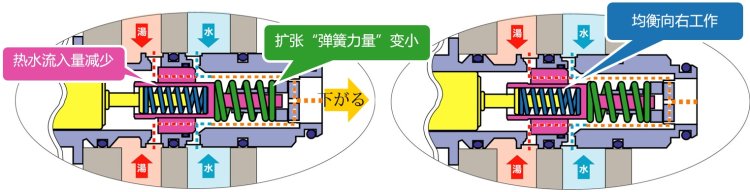 记忆金属弹簧是日本发明的技术,主要在日本使用。记忆弹簧会根据水温变化,瞬间改变自身的形状,带动控制轴来调节阀芯,阀芯又调节混水,保持水温不变,达到恒温出水的效果。