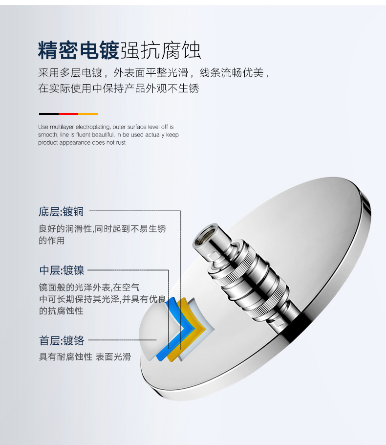 在通用技术方面,花洒和龙头都使用欧标60铜,铜含量60%,镍含量38%,2%其它成份,优于国标59铜,其实欧标60铜和美标62铜都优于国标,铅、镉重金属含量低析出少。