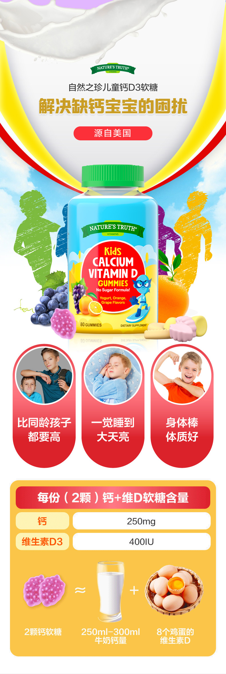 天猫自然之珍海外旗舰店109元,第二件0元,可领20元优惠券,拍2件实付89元到手。这款美国进口nature's truth 自然之珍 儿童维生素D3+钙软糖,专门为儿童设计,规格80粒,每颗D3+钙软糖 含维生素D3 400IU、钙250mg,促进骨骼和牙齿健康发育,强健肌肉,预防佝偻病。无糖型配方不用担心会引起蛀牙,让孩子在享受美味的同时补充必要的营养素。3岁及以上每天2粒。