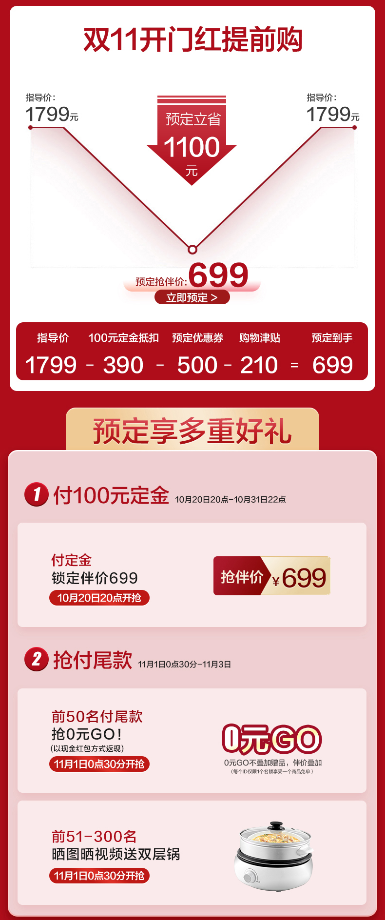 天猫格兰仕官方旗舰店,¥1799元 预售价,-390元 付定金立减,-500元优惠券,-210元 (每满200减30元)跨店满减,=699元 到手价(定金100+尾款599),11月1日0点30分前50名付尾款0元 到手。不锈钢内胆 二级能效 光波变频。可提前加入购物车20日20点准时抢,尾款时间11月1日 00:30-11月3日 23:59:59。