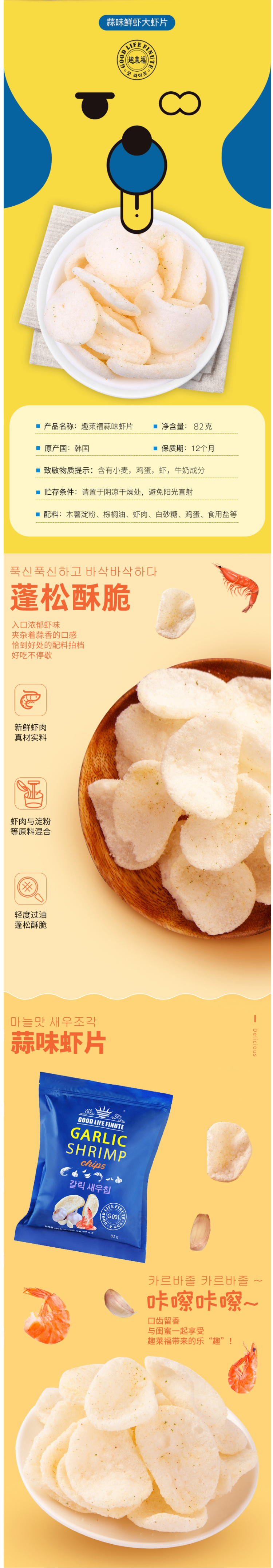这款趣莱福虾片是韩国进口,使用新鲜虾肉和淀粉等原料混合,轻度过油,蓬松酥脆,入口有浓郁虾味,夹杂着蒜香的口感。