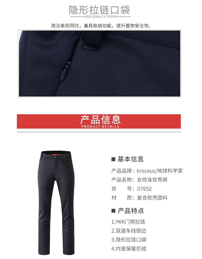 这款地球科学家软壳冲锋裤,采用复合软壳面料,摸起来的手感柔软不是很硬,外层是梭织的软壳面料,可达97%防风,还经过防泼水处理,里面是自家的Polartec抓绒,能很好的保暖;带弹力,上身不紧不勒不会影响活动性,且抗皱好打理。