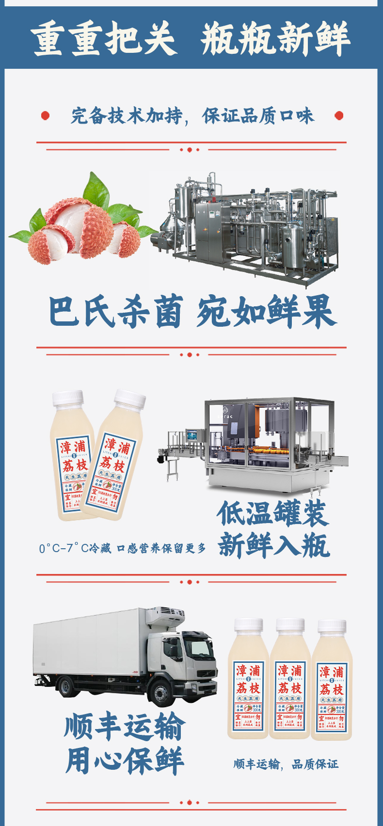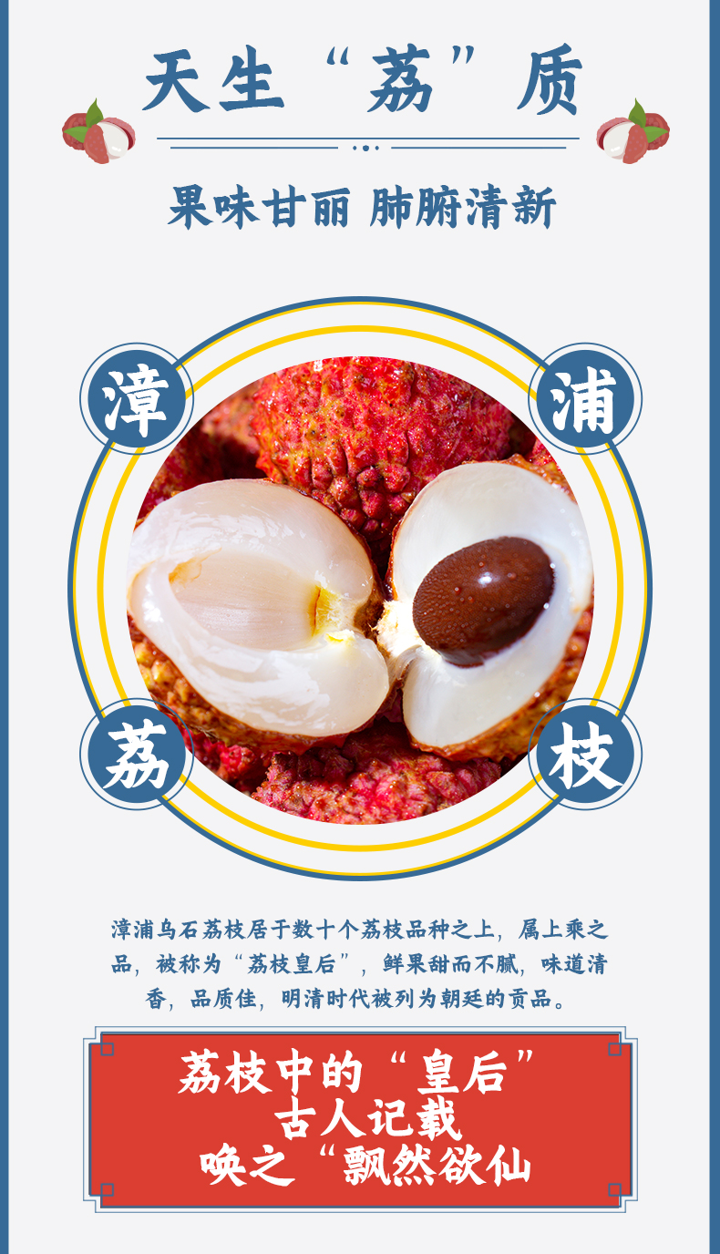 漳浦荔枝夏季童年怀旧饮料,甄选有“荔枝皇后”美誉的漳浦乌石荔枝为原料,明清时代被列为朝廷的贡品,鲜果甜而不腻,味道清香,品质极佳,这款为100%荔枝复合果汁,0色素0蔗糖0香精0脂肪0防腐剂,巴氏杀菌0-7℃保质期45天。