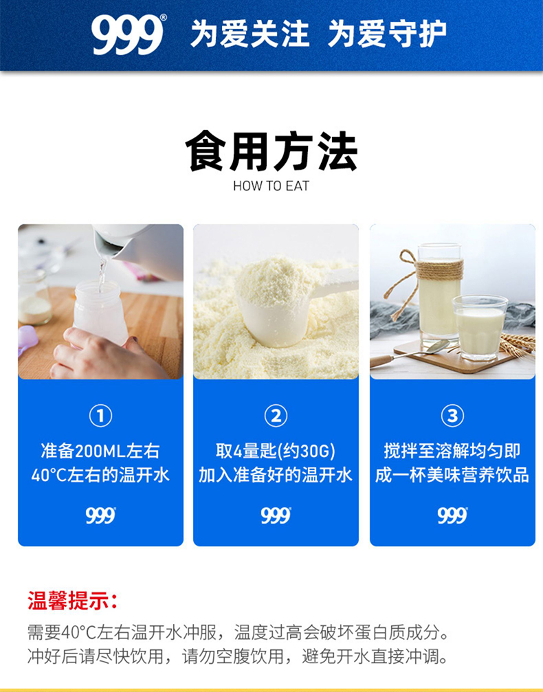 规格:500g罐装,每次取4勺约30g,加入200ml 40℃温水冲泡。
