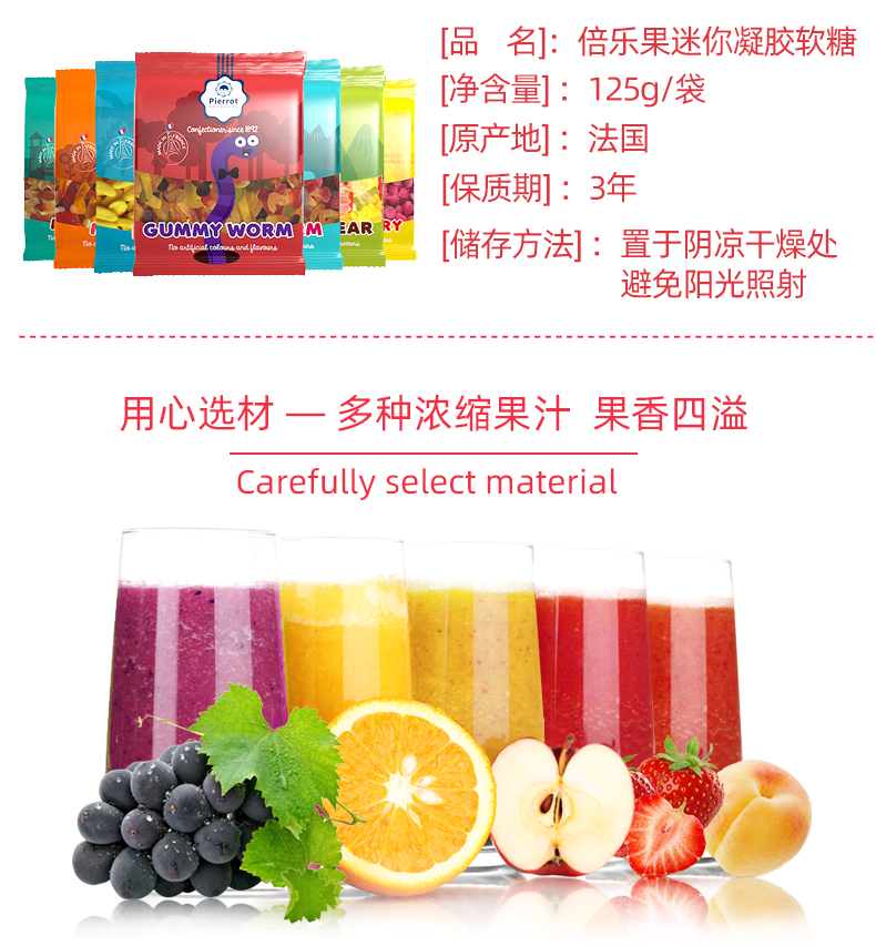 这款倍乐 水果味橡皮糖,是一款软糖,法国进口,缤纷水果味,果香四溢,口感酸甜,Q弹有嚼劲。