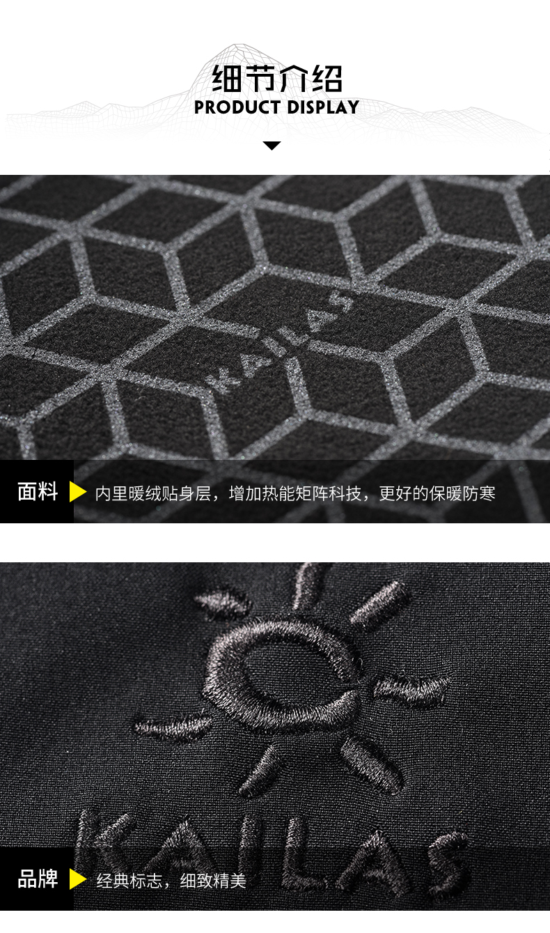 这款凯乐石Kailas软壳裤,采用高密度科技面料,防风、防泼水、透气、保暖,可保持体表干爽舒适;运用热能矩阵科技,面料里层是THERMAL MATRIX科技面料含自然发热涂层,可释放负离子平衡,强效聚温保暖,面料还混有10%的氨纶弹性纤维,上身不紧绷,