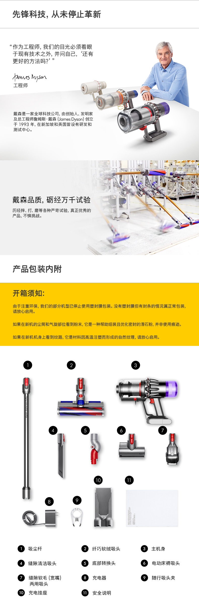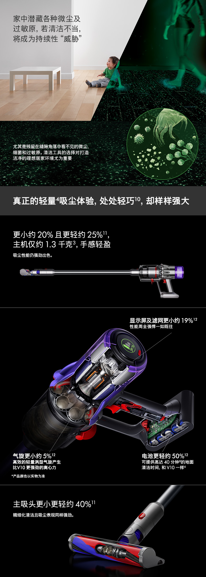 戴森 Digital Slim系列手持无线吸尘器,马达转速12万每分钟,强效模式吸力为100AW,主机1.3kg,较上代减轻30%。