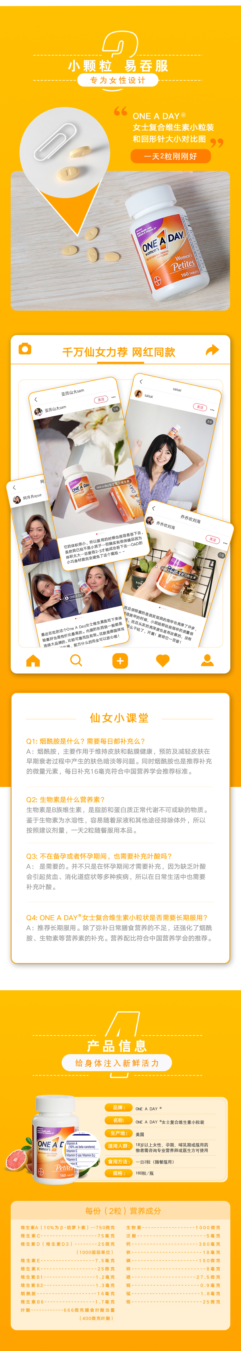 这款One A Day 女士复合维生素,美国原产,是一款专为女性“量身定制”的复合维生素,迷你小片剂 易吞服不卡嗓。富含生物素、烟酰胺和多种复合维生素,为人体提供全面营养,有助皮肤健康、补充能量,维持免疫力,含维生素A、C、D、E、K,含B族维生素,含铬、含铁,还有钠、钙、镁、锌、硒、铜、锰、铬、叶酸,富含生物素。
